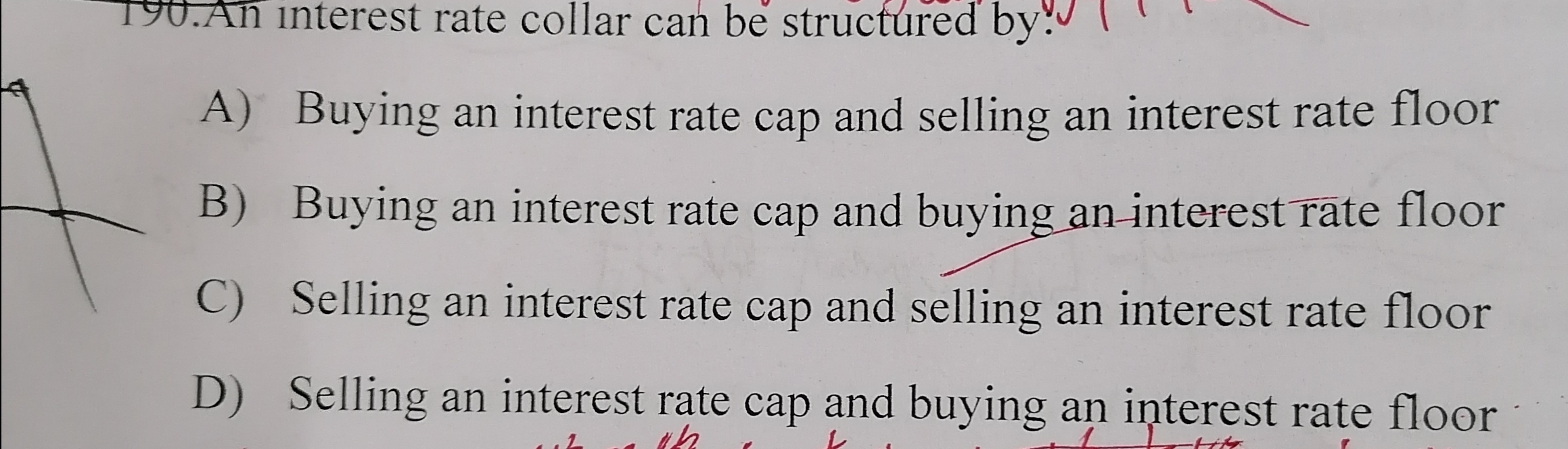 利率封顶(Interest Rate Cap)又称“利率上限”,客户同银行达成一项协议,指定某一种市场参考利率,同时确定一个利率上限水平。在此基础之上,利率封顶的卖出方向买入方承诺:在规定的期限内,如果市场参考利率高于协定的利率上限水平,卖方向买方支付市场利率高于利率上限的差额部分;如果市场参考利率低于或等于协定的利率上限水平,则卖方无任何支付义务。买方由于获得了上述权利,必须向卖方支付一定数额的期权费。相对而言,利率上限水平越高,期权费率越低;期限越短,期权费率也越低。利率封底(Interest Rate Floor)又称“利率下限”,与利率封顶相反,利率封底是客户与银行达成一项协议,指定某一种市场参考利率,同时确定一个利率下限水平。在此基础之上,利率封底的卖出方向买入方承诺:在规定的期限内,如果市场参考利率低于协定的利率下限水平,卖方向买方支付市场利率低于利率下限的差额部分;如果市场参考利率高于或等于协定的利率下限水平,则卖方无任何支付义务。买方由于获得了上述权利,必须向卖方支付一定数额的期权手续费。利率两头封(Interest Rate Collar)又称“利率上下限”,是将利率封顶和利率封底两种金融工具合成的产品。具体地说,购买一项利率两头封,就是在买进一项利率封顶的同时,卖出一项利率封底,以收入的期权费来部分抵销需要支出的期权费,达到既规避利率风险又降低费用成本的目的。卖出一项利率两头封,则是指在卖出一项利率封顶的同时,买入一项利率封底。当借款人预计市场利率会上涨时,可以考虑购买一项利率两头封。此题答案为A