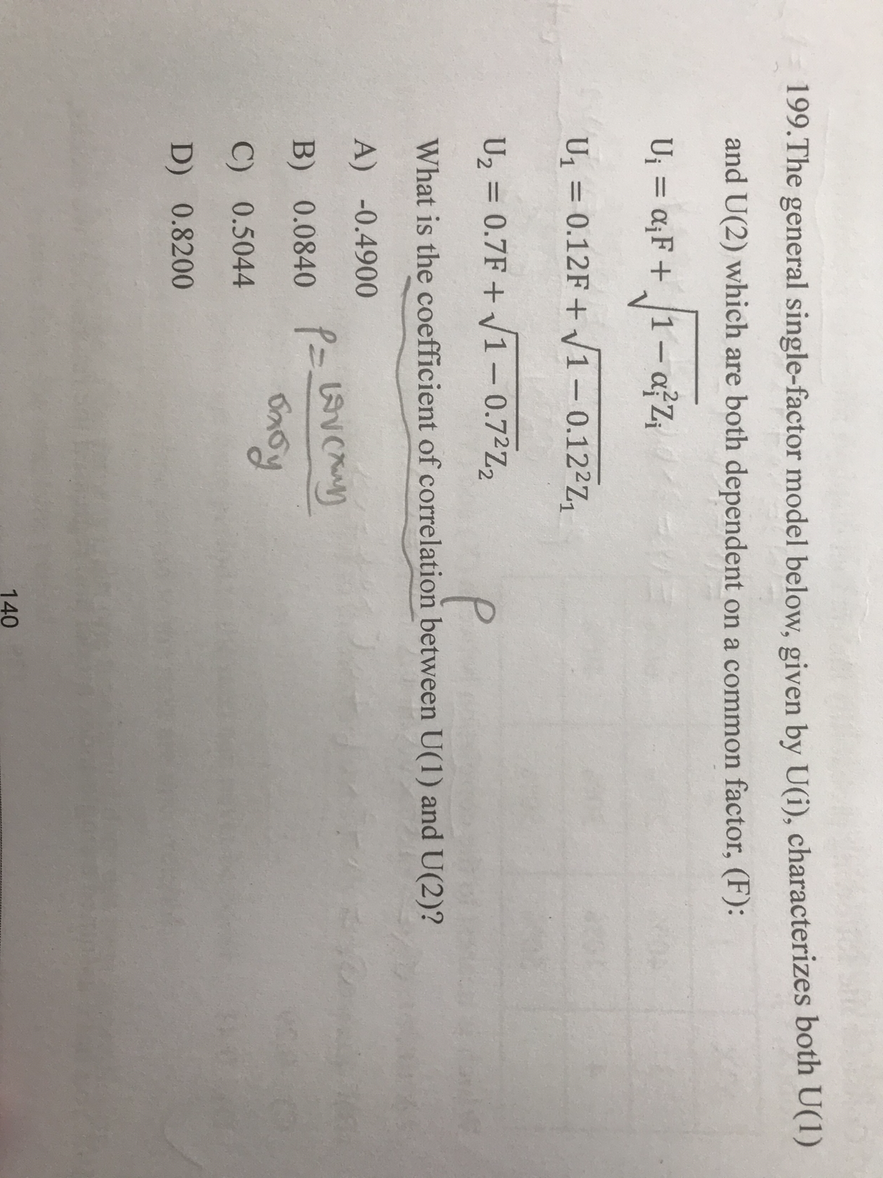 ρ(U1,U2)=COV(U1,U2)/ [σ(U1)^2*σ(U2)^2]=COV(0.12F+(√1-0.12^2)Z1,0.7F+(√1-0.7^2)Z2)/ [σ(0.12F+(√1-0.12^2)Z1)^2*σ(0.7F+(√1-0.7^2)Z2)^2],最终推导得出ρ(U1,U2)=0.12*0.7=0.084,这类题目比较少见,不用过度纠结