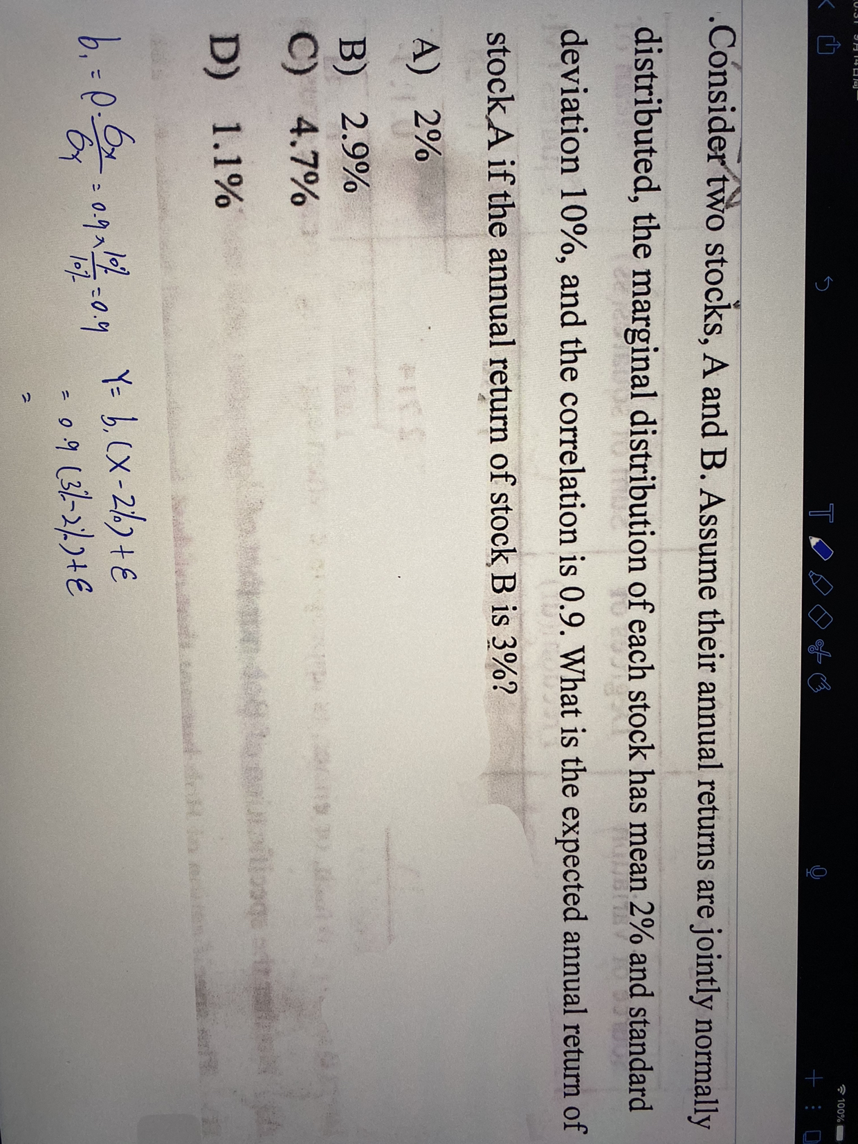 这道题你可以看作是两个股票资产超额收益率之间做回归,即股票A与股票B之间的相关性分析。具体参考下图。只不过这道题股票A和股票B属于联合正态分布,该知识点属于数量中Measuring Retures,Volatility and Correlation章节,只不过这道题的边际正态分布均值和方差数值都一样,此处具有迷惑性。该知识点与第一章风险管理基础中的单因素模型(此模型中的无风险收益率相当于改题目中的E(A)/E(B))比较相似