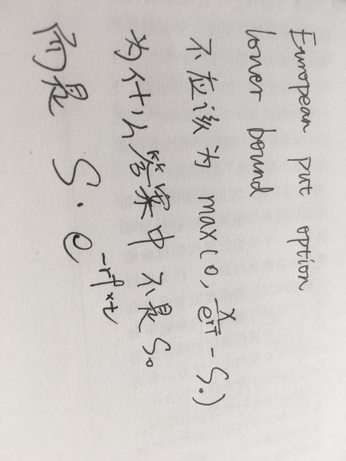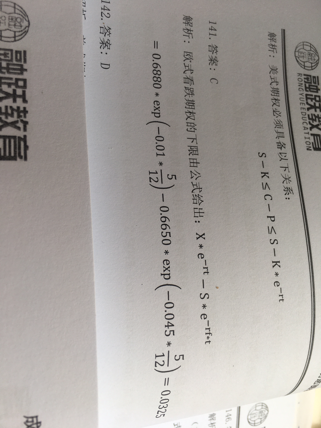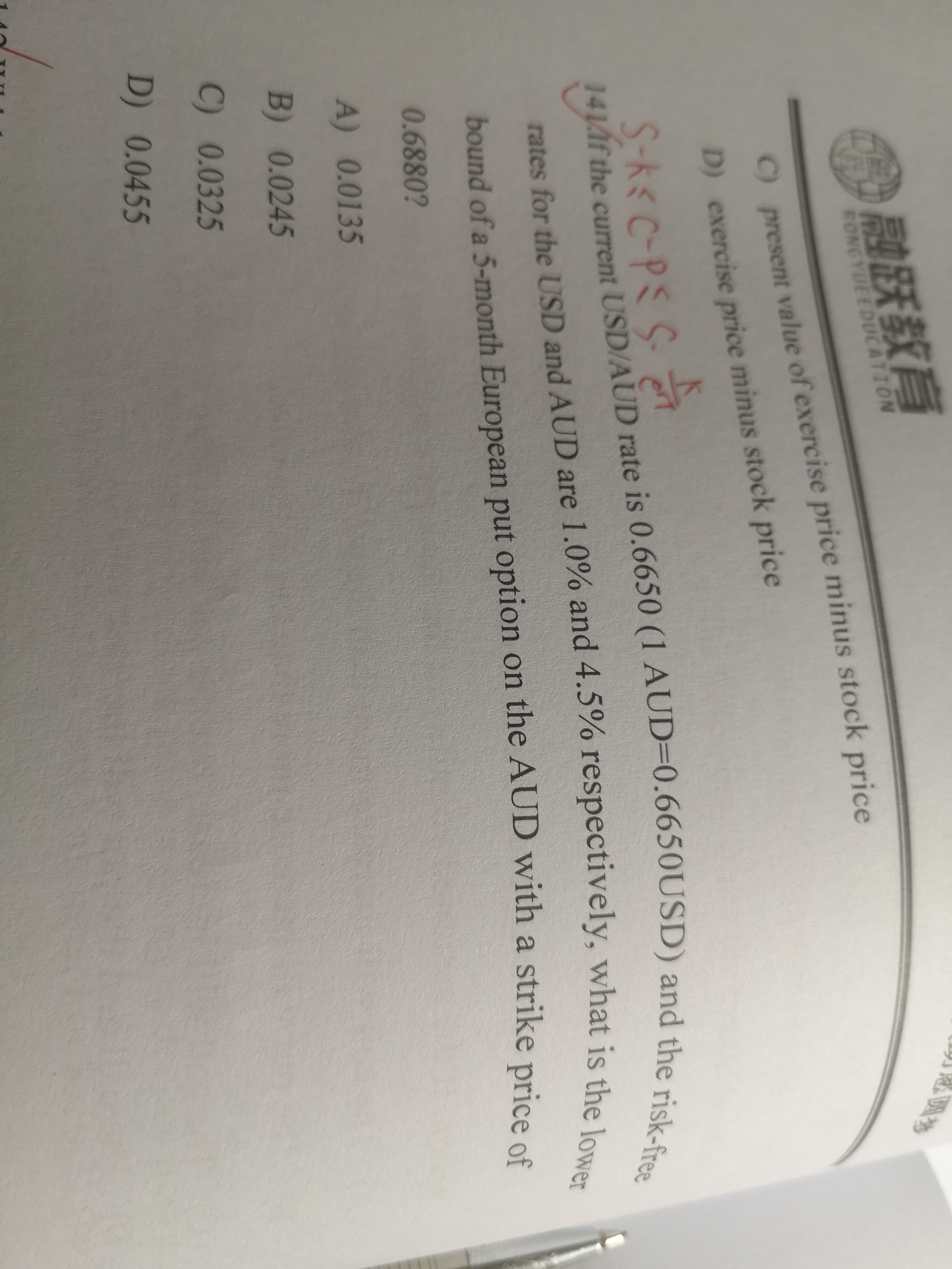 同学你好,计算过程参考答案,这道题考察的是欧式看跌期权的上下限问题,欧式看跌期权在零时刻上下限范围是(K*e-rt-S0,K*e-rt),这道题只问了改期权的下限,即用K*e-rt-S0计算即可,这道题的特殊性在于期权的标的资产是汇率,所以需要对S0进行进行调整(把外汇看成某种商品,货币对应的利率即为便利收益率,所以需要进行折算即e*-4.5%*5/12),因为前一个本质上是外汇商品的折现率,用本币美元的利率去作为折现率,后一个利率本质上是外汇商品的便利性收益率,用外汇商品外币AUD的利率去作为便利性收益率。