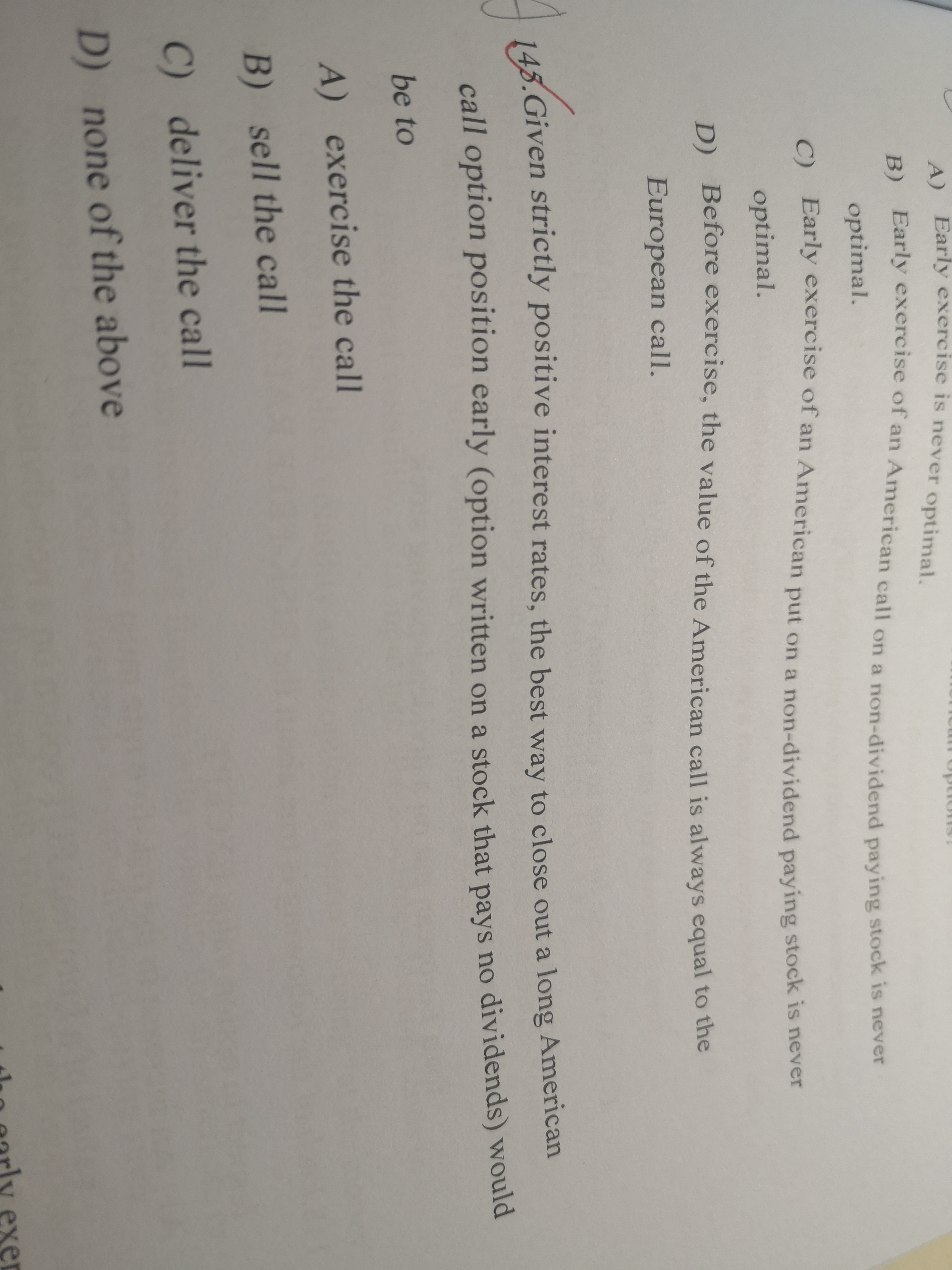 同学你好,题干问的都是对不分红的美式看涨期权提前平仓的最好方式是什么,对于不分红的美式看涨期权来说,提前行权并不是最佳选择,所以A和C都不对,B选项说的sell the call 就是平仓的意思。