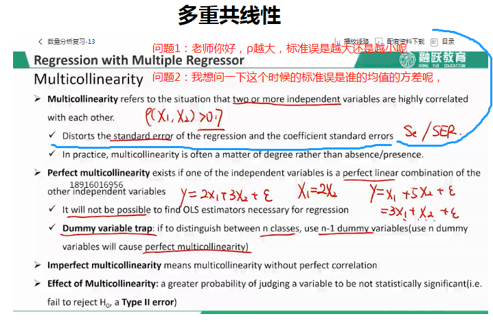 同学你好,假如多元线性回归中出现多重共线性问题,意味着,某一个自变量可以用其他自变量的线性组合来表示,回归方程就会出现多个,回归系数也会不稳定,回归系数的标准差也会变大。课件中说的标准误指的是回归系数的标准误。