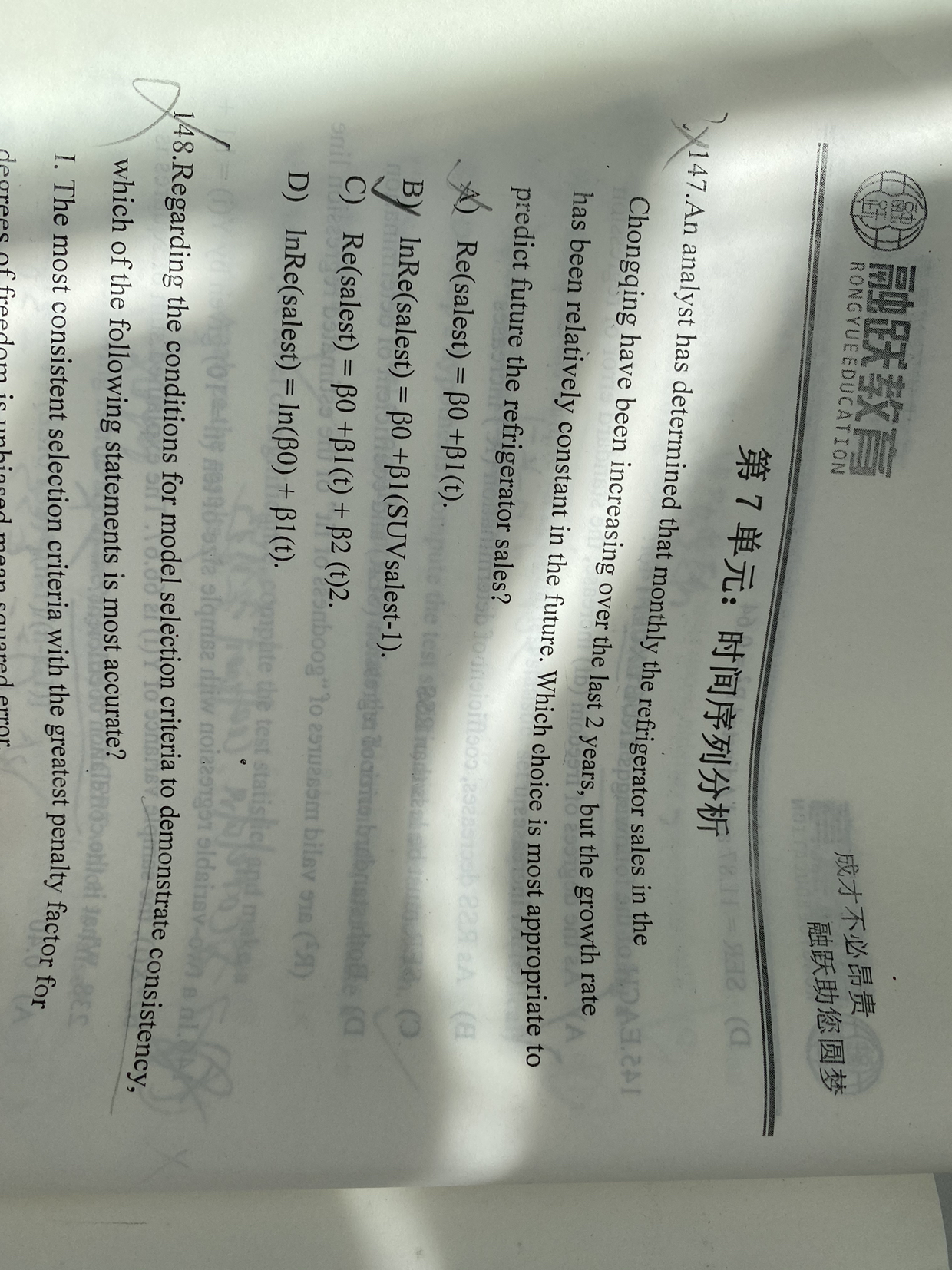 同学,这个题目就是选D哈,对数线性模型最适合于以相对恒定的增长率增长的时间序列