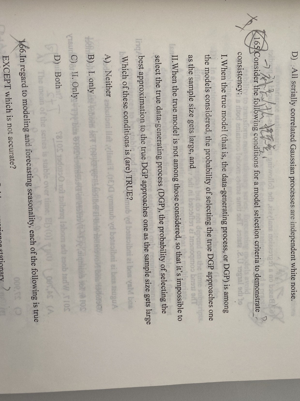 同学你好,这道题考察的是统计量标准中的一致性特征,第一个说法是当真实模型在样本集中,那么随着检测样本数量的增加,找到真实模型的的概率为1;第二个说法是当真实模型不在样本集中,那么随着检测样本数量的增加,找到接近于真实模型的模型的概率为1,这两者都是一致性的特征。