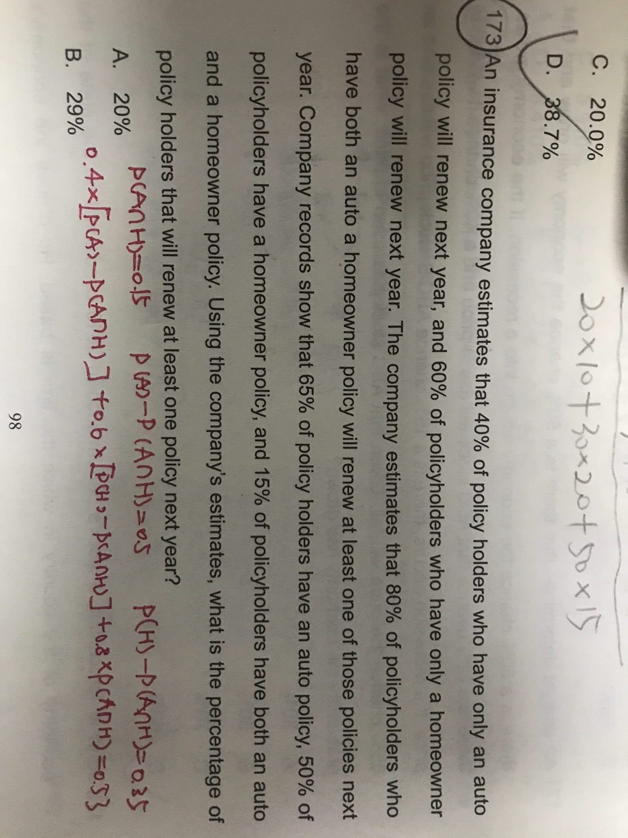 同学,这个题目考察全概率公式,分别给出在policy holder中有50%的auto policy、15%的both、35%的home policy,又给出auto policy、both、home policy分别续报的概率40%、80%、60%,根据全概率公式可求出下一年renew的概率