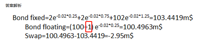 同学你好,这道题的互换时间点不是在付息日,针对不在付息日的互换价值计算,需要考虑从互换时间点到上一个付息日这段时间的票息现值,这里的1就是0.25年的票息。