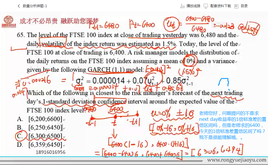 老师你好,可能你还咩有明白我的疑问哈,我的疑问是:题目不是问你 另一天的收益率的1倍标准差的范围是多少,不应该是 R(next)+-1σ。我对答案的理解是 R(today)+-1σ。