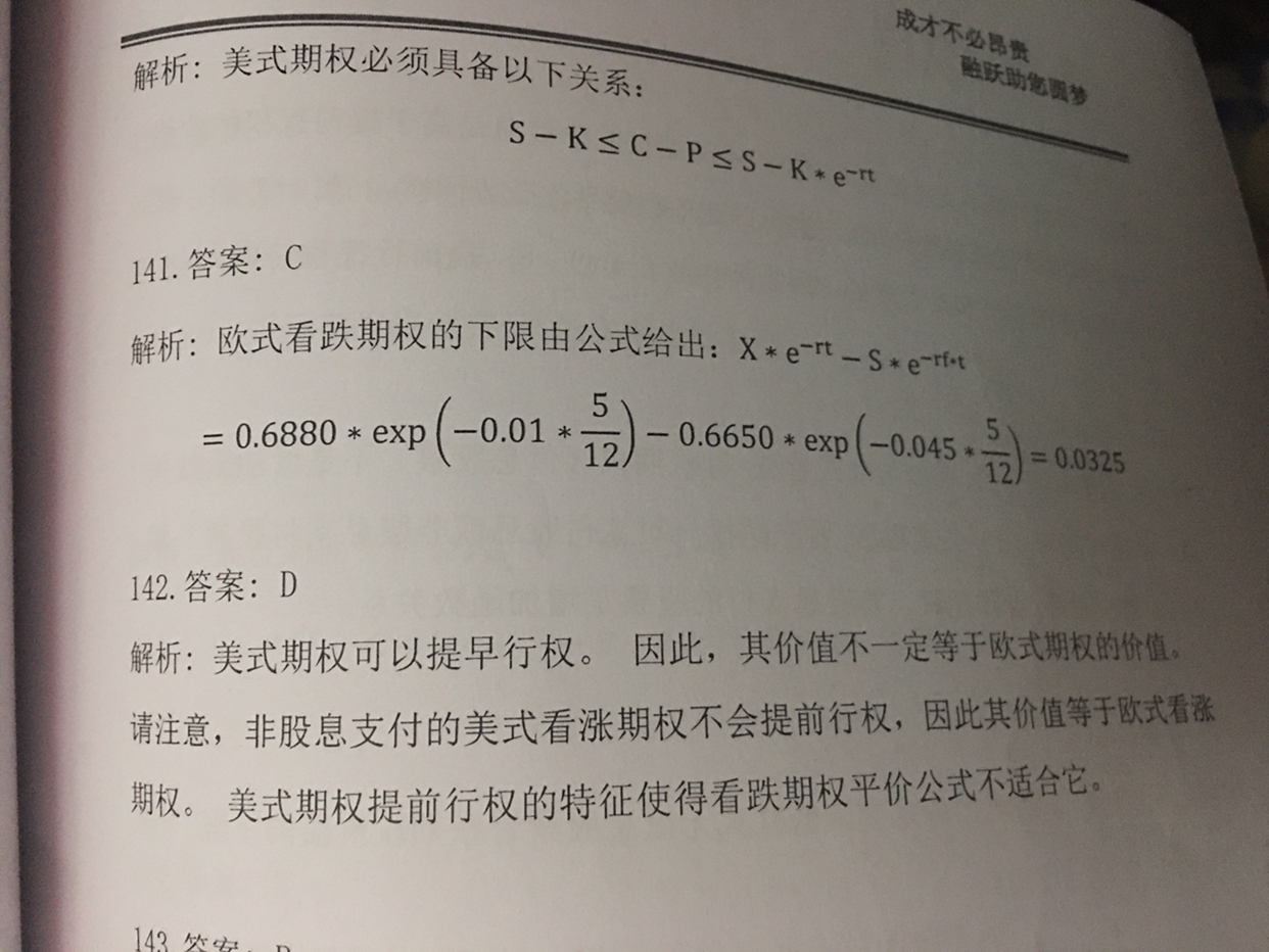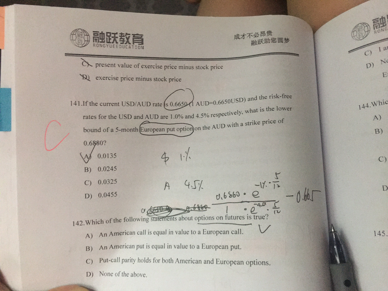 同学你好,这道题考察的是欧式看跌期权的上下限问题,欧式看跌期权在零时刻上下限范围是(K*e-rt-S0,K*e-rt),这道题只问了改期权的下限,即用K*e-rt-S0计算即可,这道题的特殊性在于期权的标的资产是汇率,所以需要对S0进行进行调整(把外汇看成某种商品,货币对应的利率即为便利收益率,所以需要进行折算即e*-4.5%*5/12)。因为前一个本质上是外汇商品的折现率,用本币美元的利率去作为折现率,后一个利率本质上是外汇商品的便利性收益率,用外汇商品外币AUD的利率去作为便利性收益率。