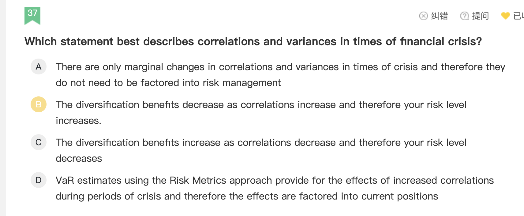 同学你好,这道题考察的是在金融危机下资产之间的相关性和风险水平及相应的组合收益。因为在金融危机下,大部分资产的相关性都急剧上升,风险增加,相应的组合收益下降,甚至亏损。所以选B。