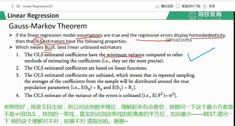 同学你好,这里的最小方差指的是回归系数β的最小方差。另外,你再PPT里面的批注理解是正确的。