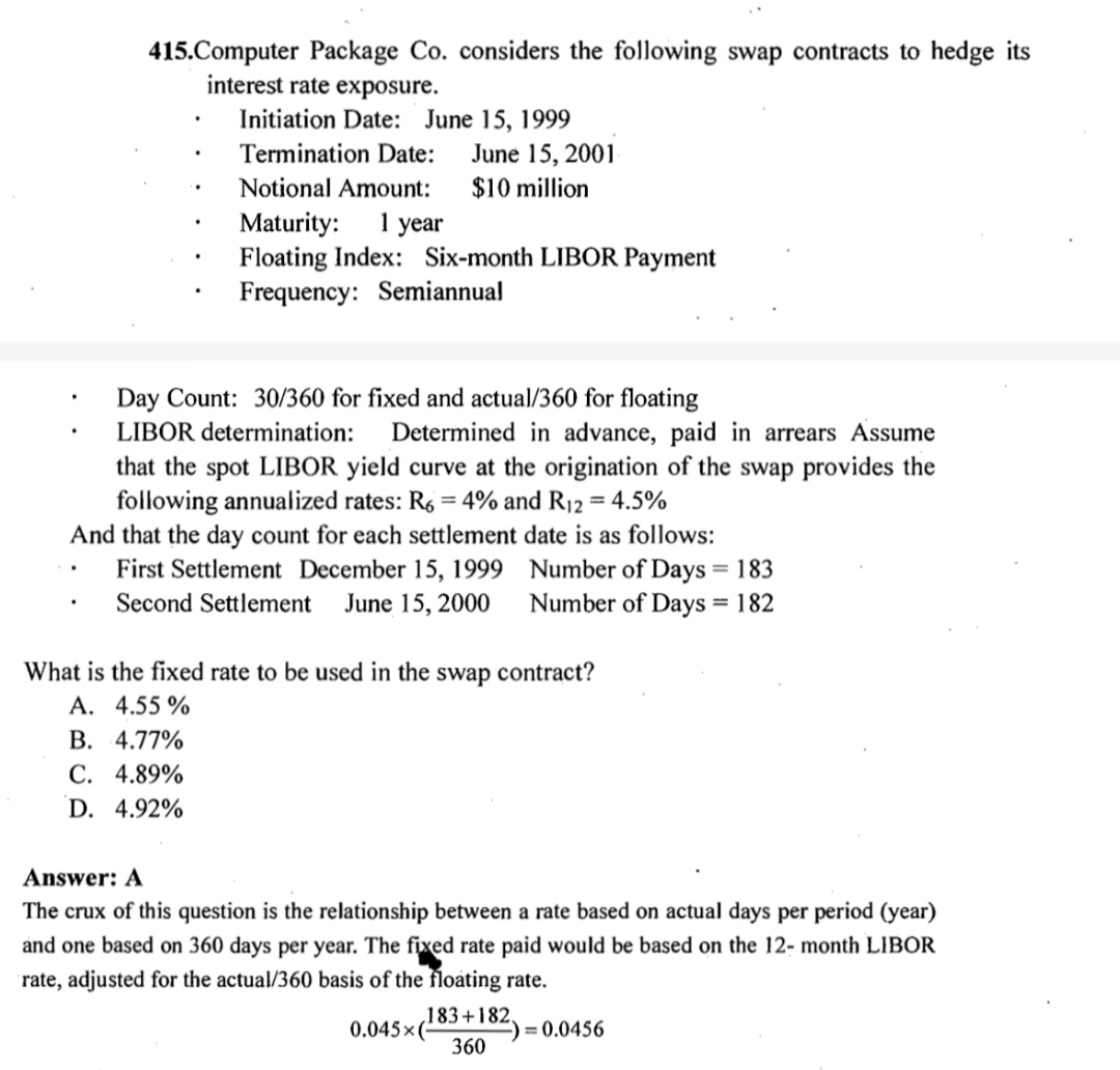 本题考察利率互换中固定利率的选择,选择12月的LIBOR然后进行期限调整,0.045*(183+182)/ 360=0.0456