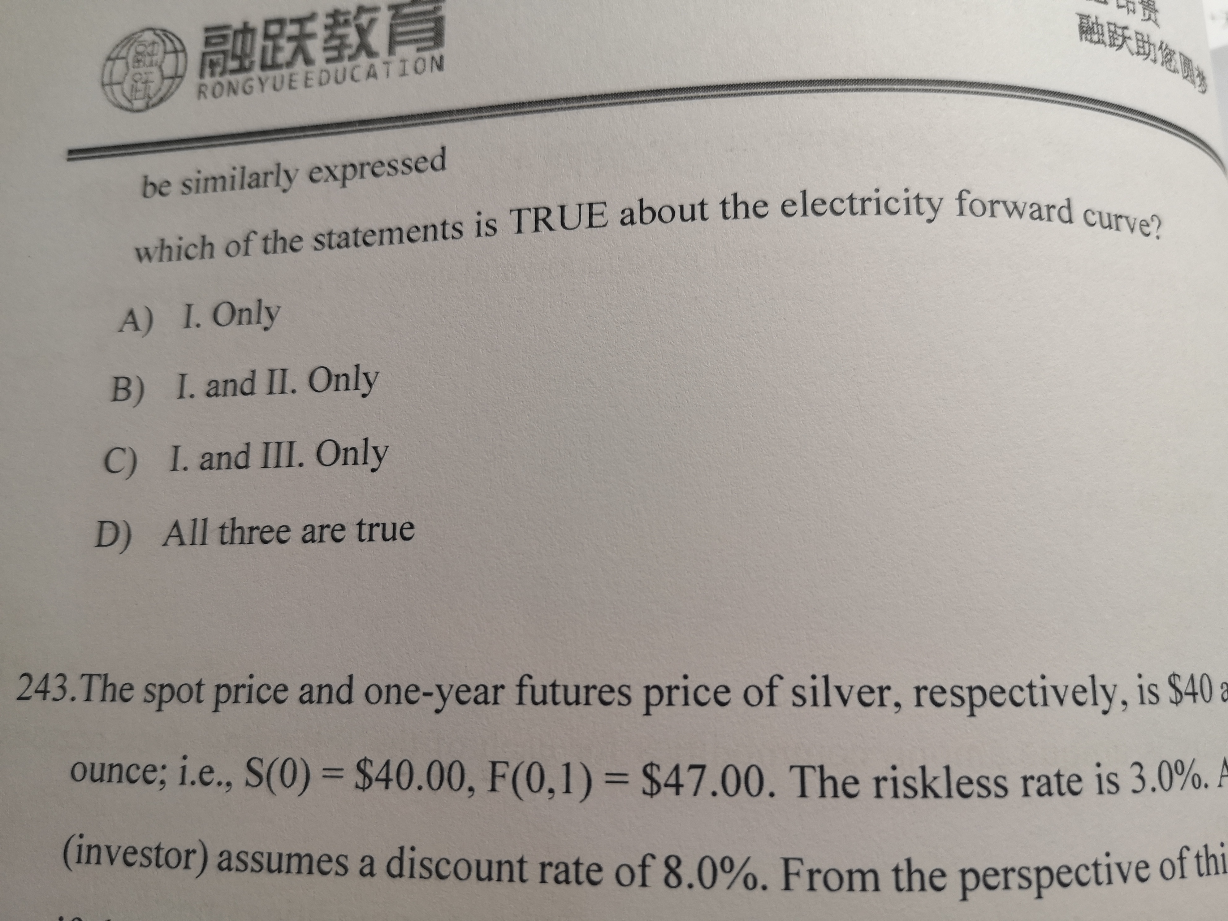 同学你好,因为电也是一种大宗商品,其远期合约跟其他大宗商品定价机制类似,只是电没有贮存成本,所以第一个说法对,第三个说法错误;也受供需关系的影响而导致价格不断变动,所以第二个说法正确,所以选B. electricity远期价格表达式不需要背。