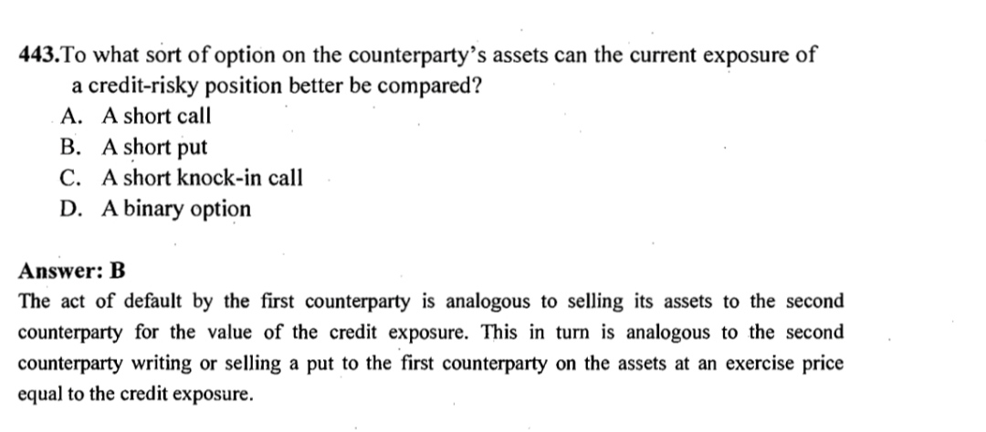 题干意思是交易对手资产上的哪种选择能更好地与信用风险头寸的当前敞口进行比较?卖出看跌交易对手方的资产,如果交易对手方的资产下跌,交易正常进行的话,对方资产下降,我们期权是亏损的,但实际交易的时候可以低价买进从而抵消亏损,我们获益;如果交易对手方的资产上涨,我们还可以得到一笔期权费,所以卖出看跌交易对手方的资产是最有益的