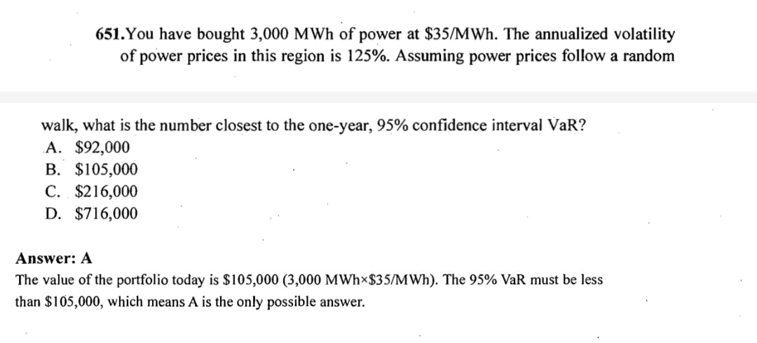 同学,这个题目中提到power的价格服从随机游走,并不是正态分布,所以不能准确的计算出数值,根据它的总价值,可大致判断VAR小于105000