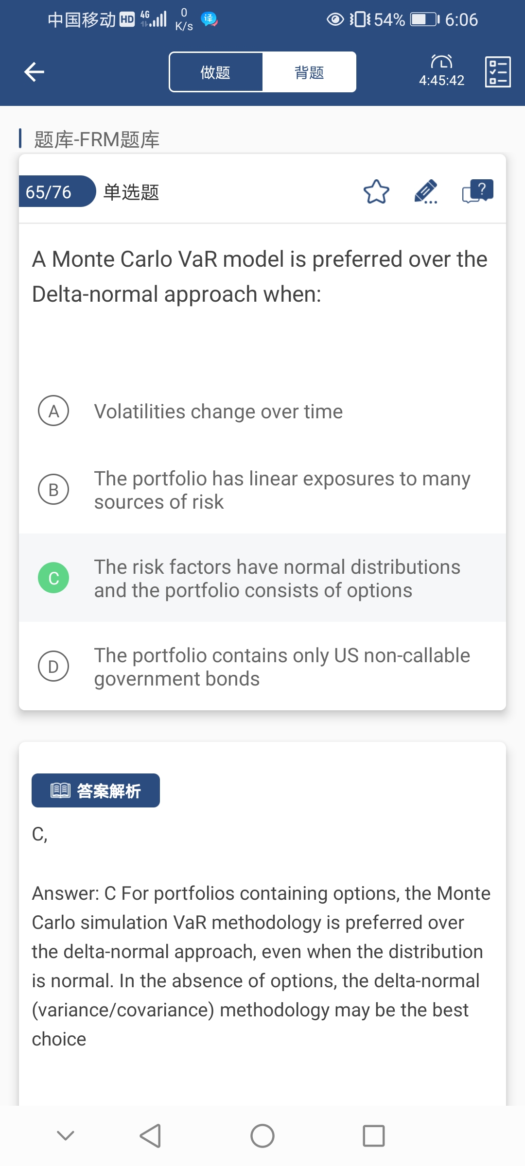 同学,delta-normal法适用于线性,不适用于极度非线性衍生品,题干中问蒙特卡洛模拟方法求VAR比delta-normal法好在哪里,应该选C,蒙特卡洛模拟方法求VAR可以适用于含期权的非线性衍生品