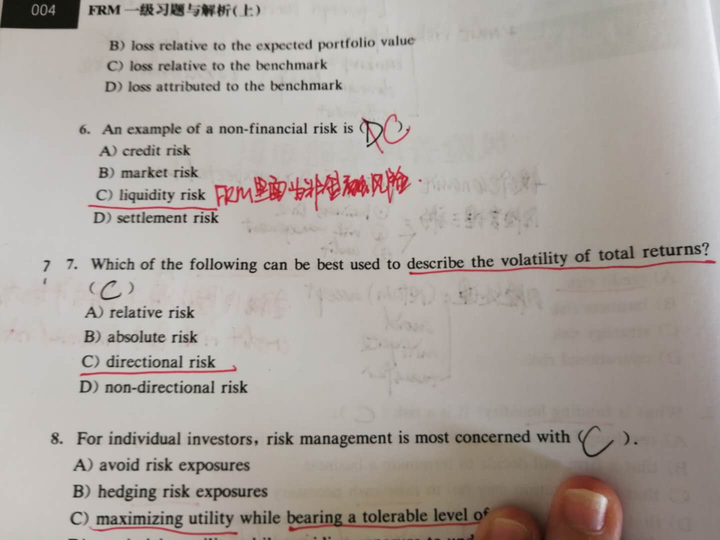 这道题考风险的一个分类,现在已经不在考纲里面了,这道题应该选B,绝对风险指的就是没有参照物的风险值,比如本题的波动率,而相对风险指的就是有参照物的,比如beta值。C项的方向性的风险就是比如市场某个走向导致的风险,与之对应的就是非方向性风险。