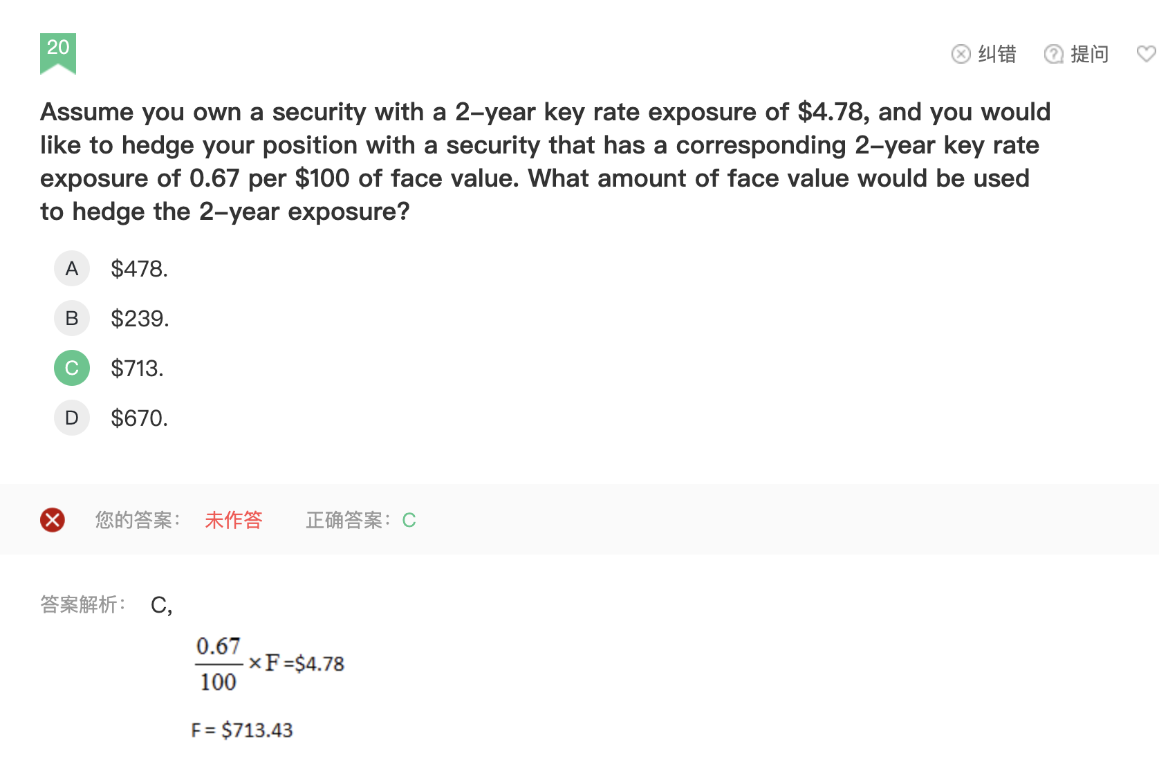 同学你好,假如对冲工具的面值是F,则F/100就是对冲合约的份数,0.67乘以合约的份数,就是对冲工具总的有效久期敞口,它应该等于头寸的总有效久期敞口。