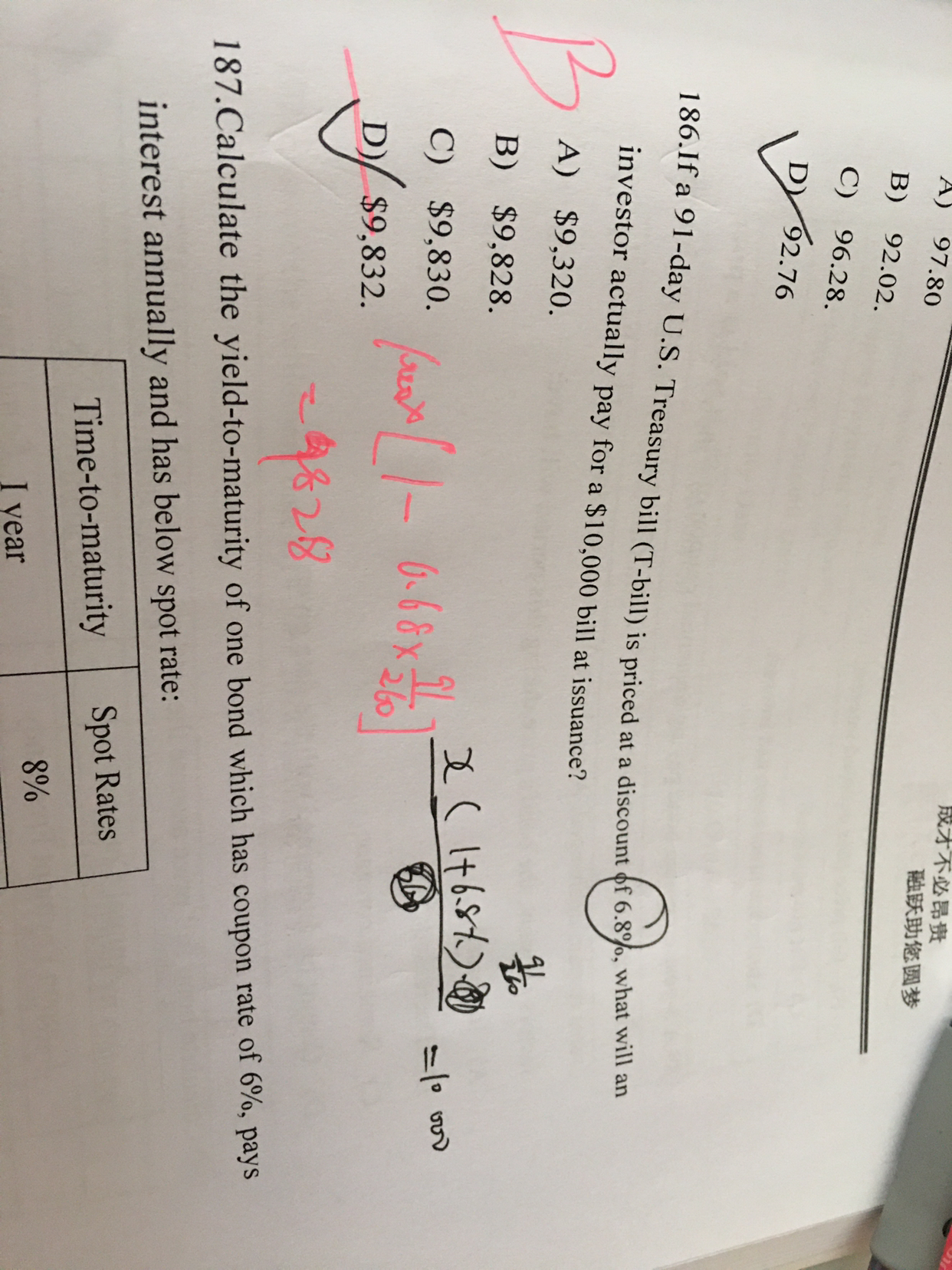 同学你好,这道题题干中的discount的意思是折价率的意思,而且是年化的,所以要转换成91天的折价率(6.8%×91/360),最后求出投资者实际购买价,也就是实际发行价。你写的公式我没看懂。