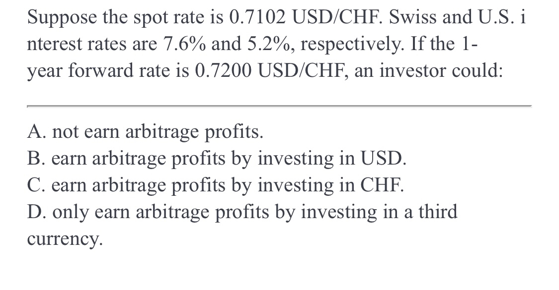 同学你好,这道题用利率平价公式计算出来的理论远期汇率应该是0.69335,但是目前市场上的远期汇率是0.7200,所以市场远期汇率被高估,说明目前汇率被低估,也就是CHF被高估,USD被低估,可以通过投资买入USD卖出CHF进行套利。
