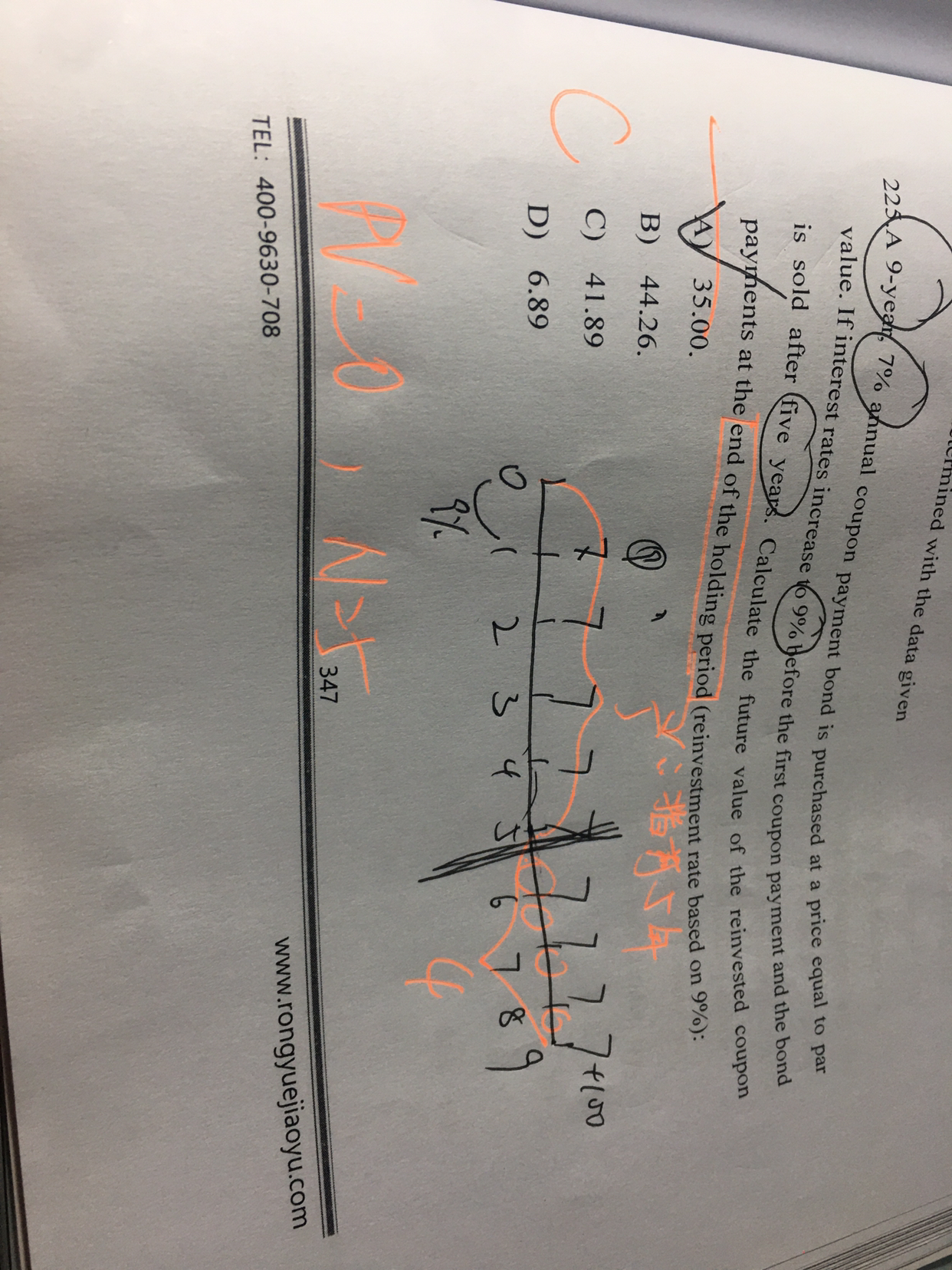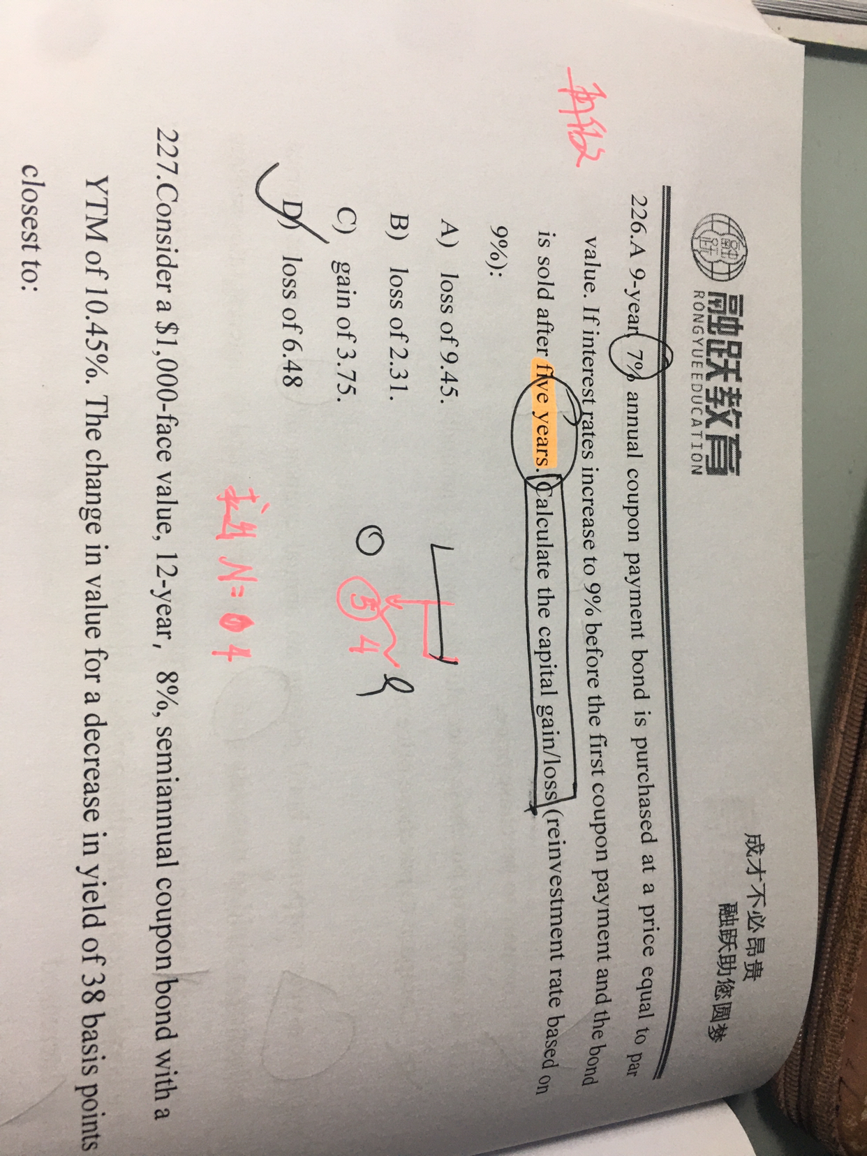 同学你好,第25题是让求的是站在第五年末在五年期间票息的再投资收益是多少,因为是在第五年末卖掉的,所以持有期是5年,N=5,第一年年初没有票息支付,所以是0,即PV=0,期间每年末都有票息流入7,所以PMT=7,已知I/Y=9,可用计算器算出来FV=47.89;第226道题说的是在第五年卖掉的盈亏情况,首先要知道成本是多少,因为是在期初以面值100购买的,所以成本是100,而收入就是在第五年末债券的现值(从债券到期折现到第五年末),因为从第五年末到债券到期还有4年,所以N=4,而I/Y从第一次支付开始就是9,债券到期为面值100,所以PV=100,票息不变仍为7,所以PMT=7,用计算器可以算出来第五年的现值PV=93.52,所以最终亏损93.52-100=6.48.