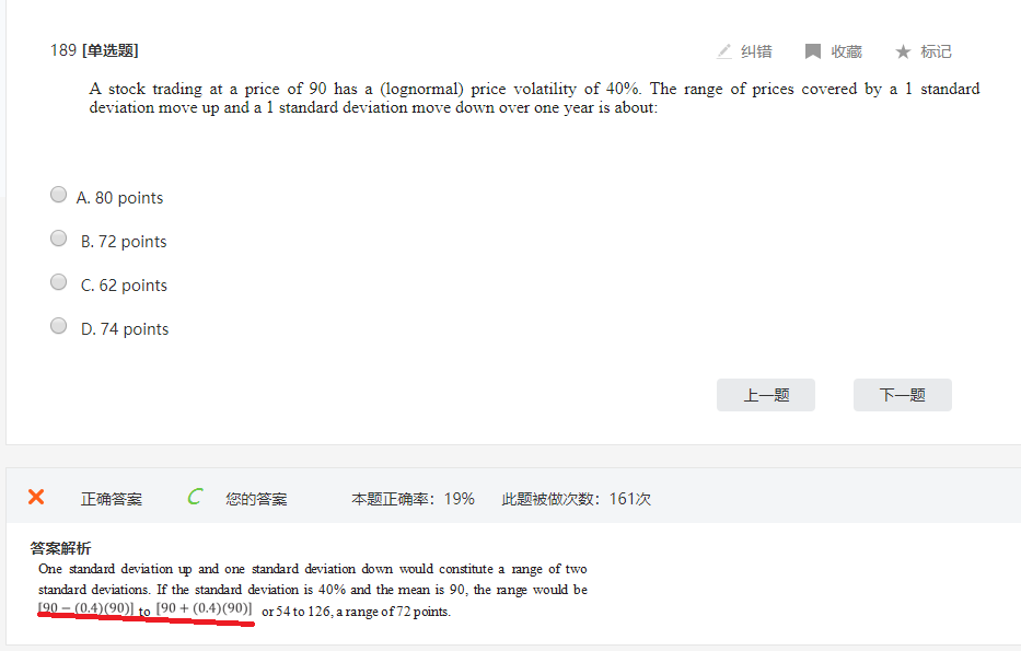 此题考察置信区间上下限的计算,变化量为(μ+/-z*σ)*P,价格的μ没有给出默认为0,则(μ+/-z*σ)*P=+/-0.4*90,最终上下限为90+/-0.4*90