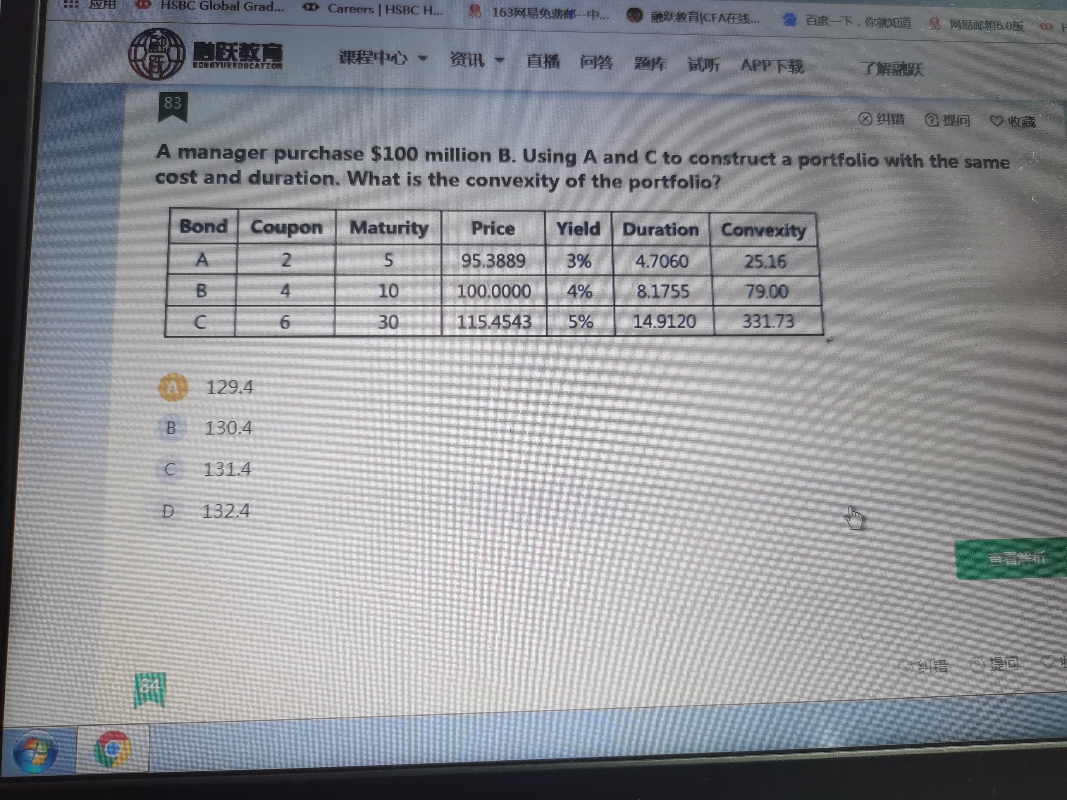 同学你好,这道题考察的是组合的久期和凸度的计算,两者都是采用加权平均法,具体计算参考图片。