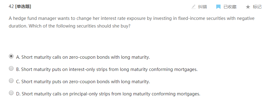 为了通过购买负的久期证券来改变其利率敞口,经理人需要投资于利率下降时价值下降的证券(利率上升时价值增加的证券)。长期零息债券的价值会随着利率的下降而增加,所以看涨期权在利率下降时价值上升,看跌期权在利率下降时价值下降,所以选C