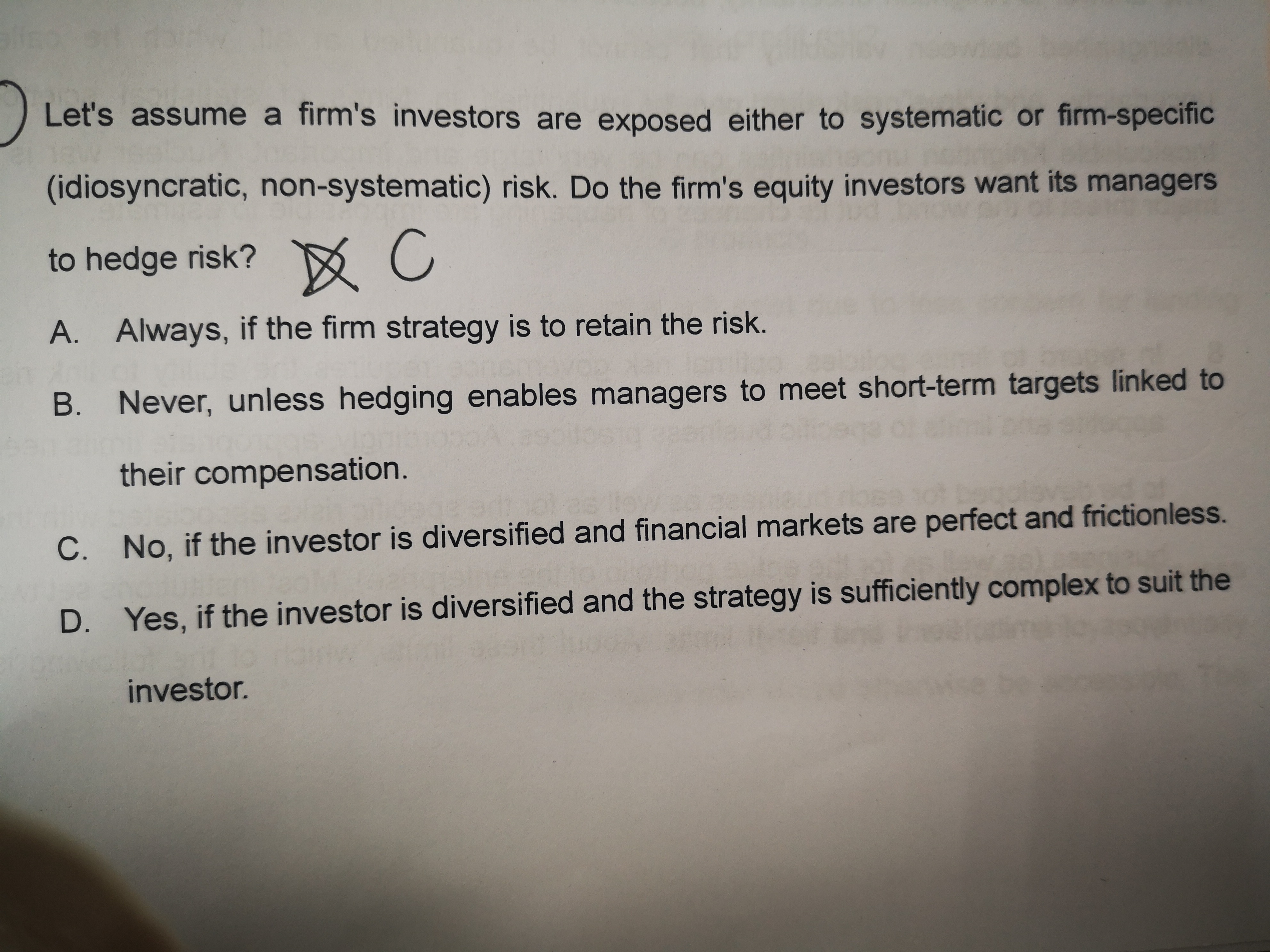 这道题说的就是就是应对应对系统性风险和非系统性风险该该怎么做对冲,A说的是如果公司的策略是保留风险,需要总是做对冲,既然是要保留风险就不需要做对冲了。关于B,风险对冲是为了对冲风险敞口而不是为了和管理层的薪酬挂钩。关于C和D,如果投资者的投资是分散的且市场是完美无摩擦市场,当然是不需要做对冲的,因为投资风险已经是足够分散化了的,所以C对,D错。