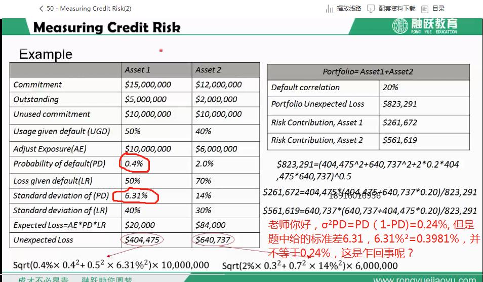 同学,你写的第一个求出等于0.24%的公式是近似的计算式,如果题干中没有给条件可以用那个,但此题中已经给出PD的标准差,则直接用就好