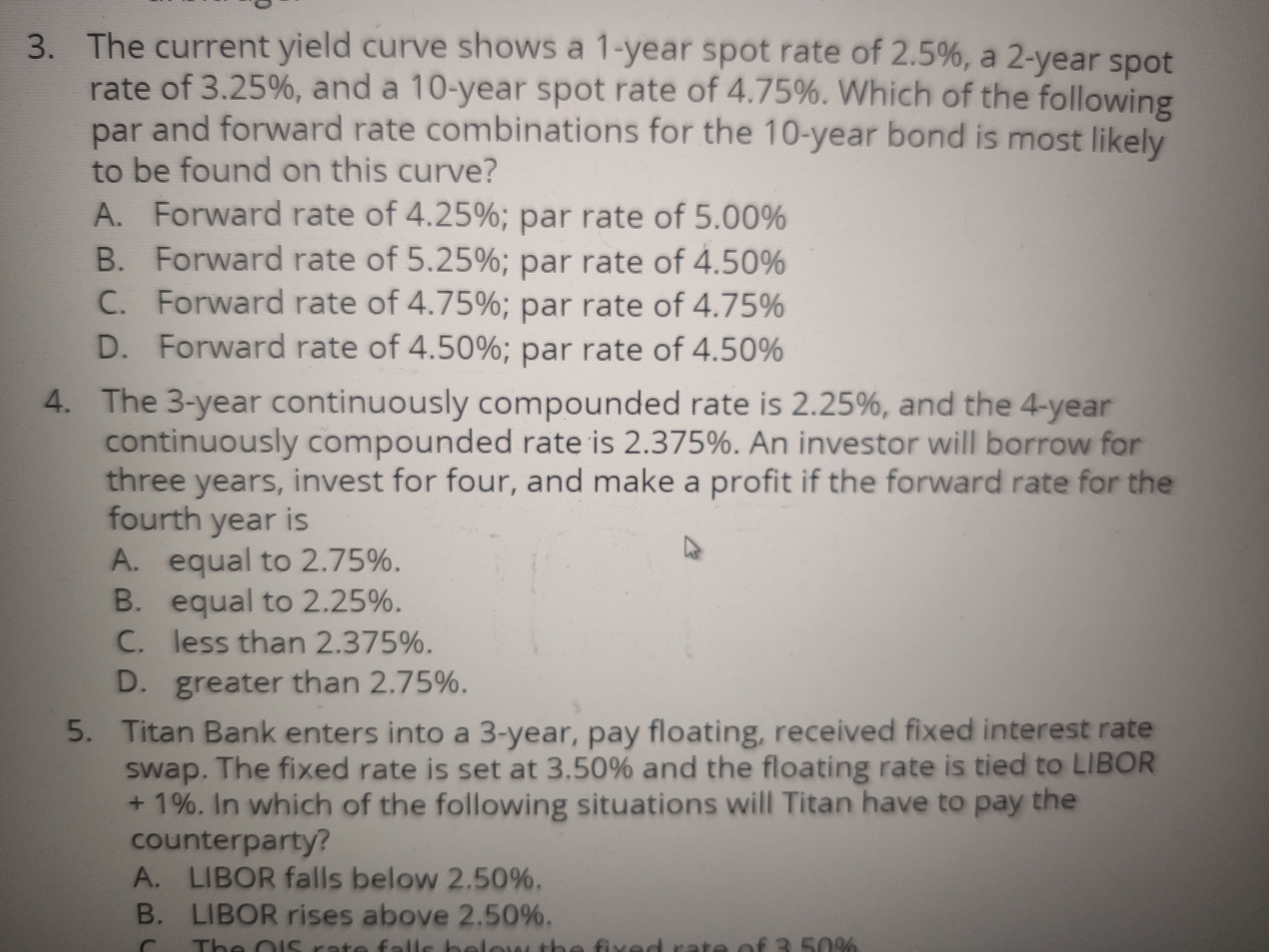 同学你好,题干说借了3年,投资4年,还差一个从第三年到第四年的一个远期利率,根据题干可以算出理论上的Foward,如果实际上的forward rate比理论的小,则到第三年末,投资者就可以以一个更低的利率去借款,所以就相当于获利了。