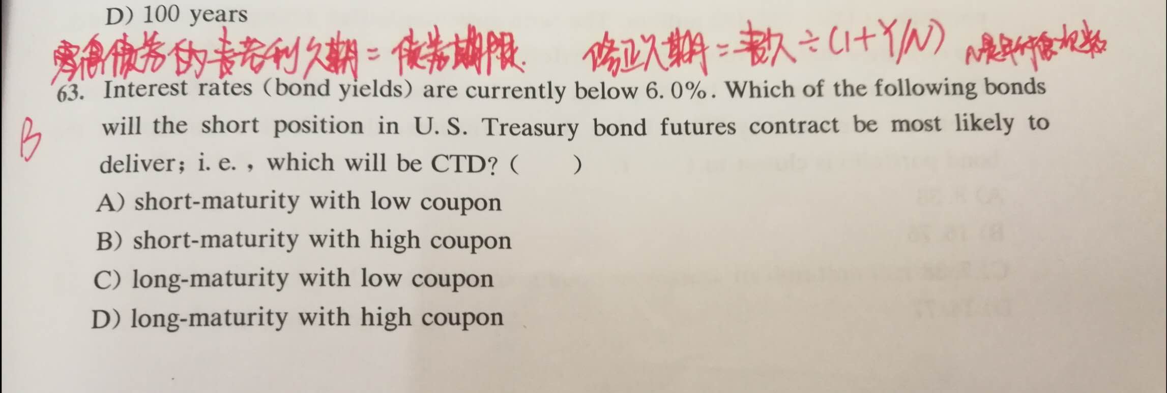 同学你好看,收益率相当于折现率,票息率相当于债券未来的现金流,久期是现金流回流时间和债券价格对利率的敏感程度。在票息率保持不变的情况下,折现率越高,债券价值越低;在折现率保持不变的情况下,票息率越高,现金流回流时间越短,也就是久期越小;久期本身并不能说越长或越短哪个更好。这道题的意思是说目前市场利率(也就是折现率)小于6%,对于国债期货空头来说哪种债券最有可能成为CTD(最便宜交割券),CTD的一般是交割净成本最低的债券,也就是说价格相对较低的可交割债券,这里有一个规律,一般情况下,在债券收益率低于6%是,会选择久期较小的债券交割(高收益意味着高风险,低收益意味着低风险,对于低风险债券而言,久期越长可以收到的收益更多,对投资者越有利,但是对于空头来说,肯定是卖出相对更差的成本更低一点。),而债券期限越短,票息越高,对应的久期就越小,所以选B,而当债券收益率高于6%时,则正好相反。