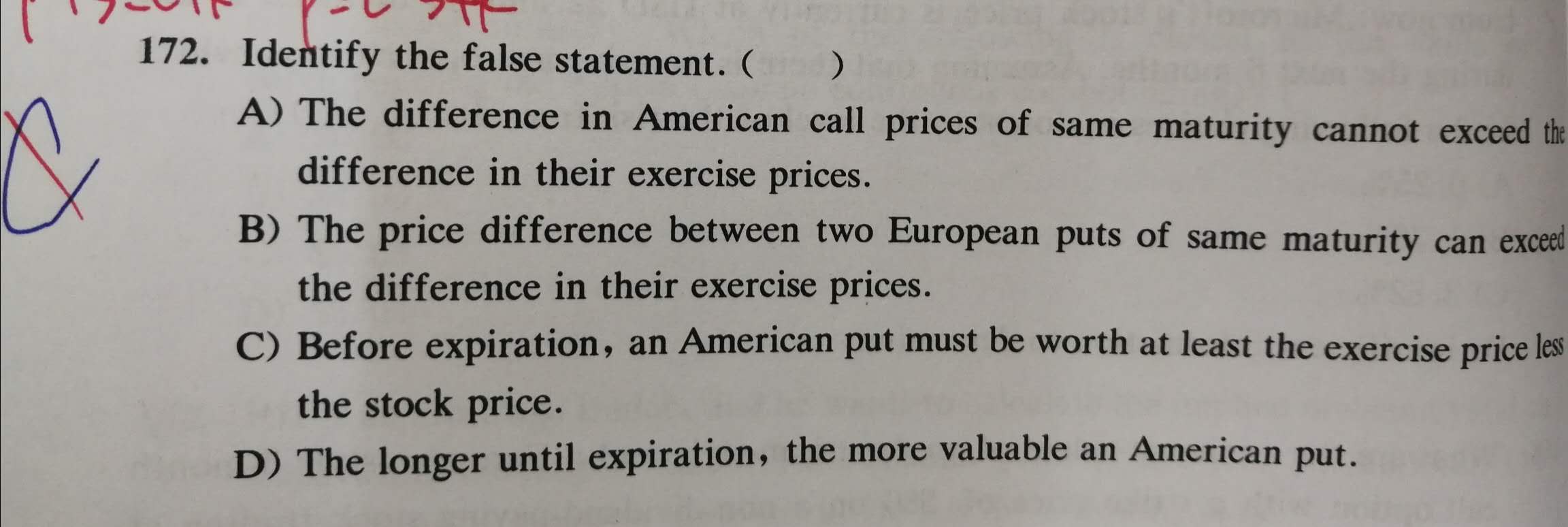 同学你好,关于A,不超过就是小于等于,包括等于期权费之差,所以A没错,B错;关于C,美式看跌期权价格应该是大于Ke^-rt-S,小于Ke^-rt,所以至少为K-S没错;关于D选项,是说的是一般情况下成立,当在极度实值情况下不成立。