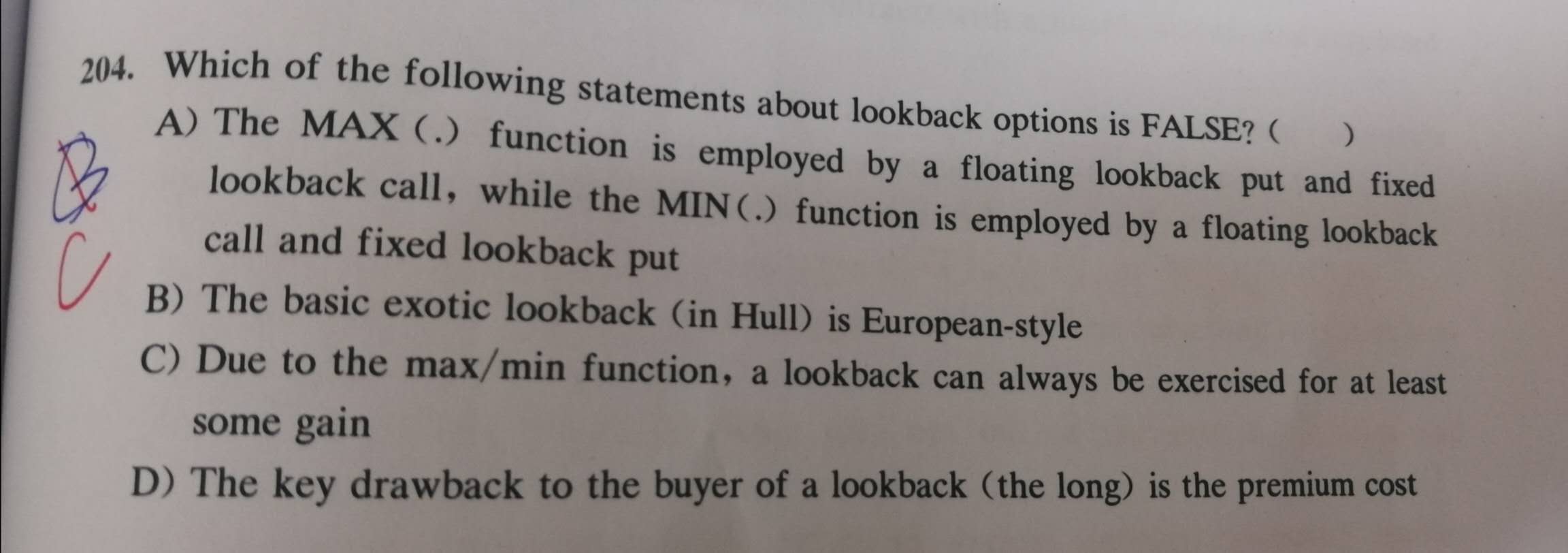 同学你好,第一个问题参考图片,根据图片可知回望期权的最低期望值可能为0,并不是C选项所说的至少有一点利得。至于B选项,有点超纲,可以用排除法去做,D选项,回望期权的期权费就是高,这是它的缺点,没有问题。