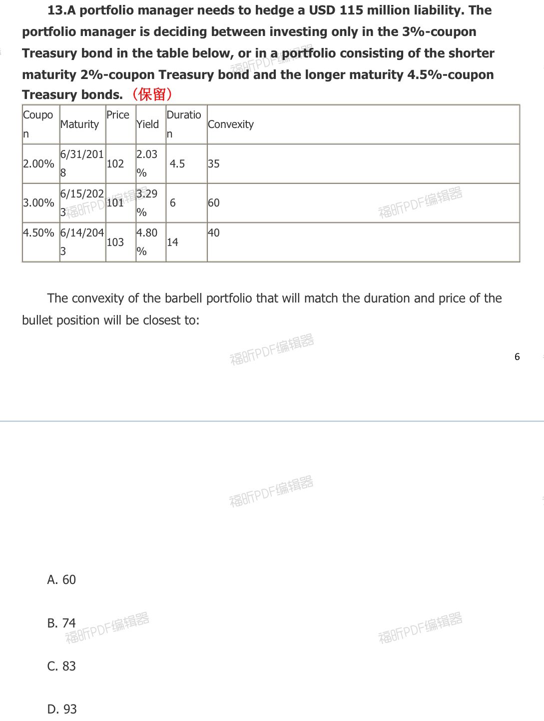 同学你好,这道题就是通过加权平均的方法对债券A和债券C对债券A的久期进行复制。我这边没有算出答案,同学方便的话可以发下答案。