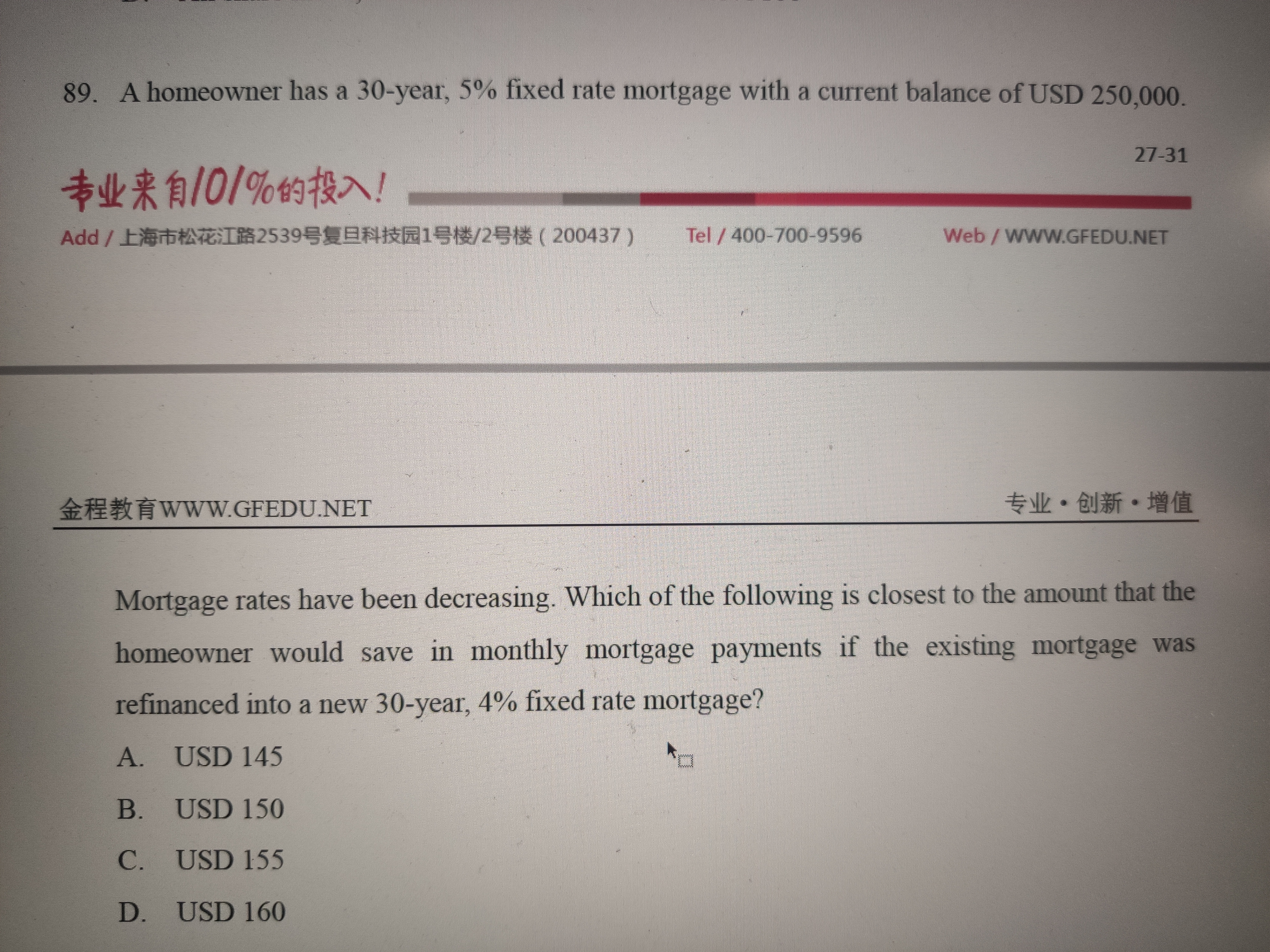 同学,N=30,I/Y=5,PV=250000,FV=0,CPT PMT=-16262.858;N=30,I/Y=4,PV=250000,FV=0,CPT PMT=-14457.524,(16262.858-14457.524)/12=150.44