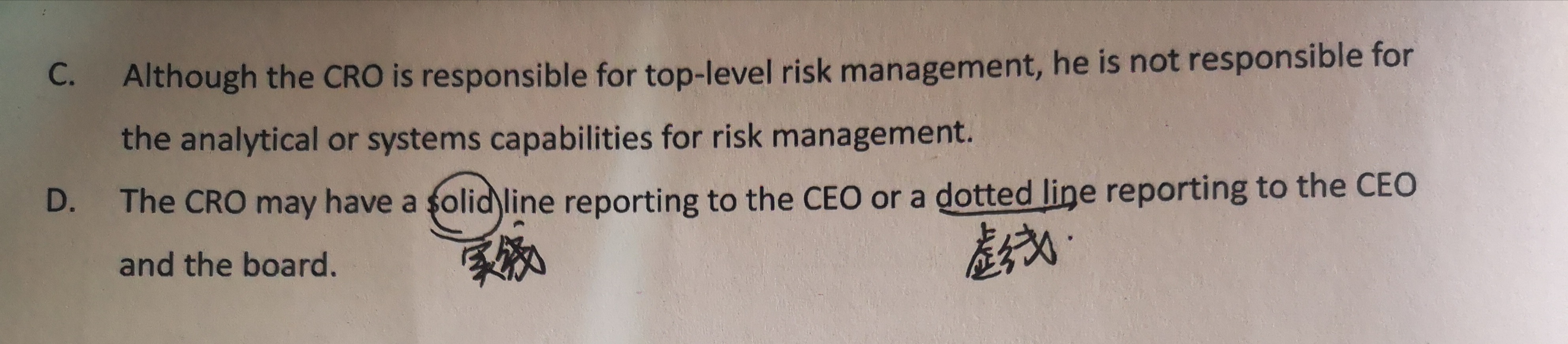同学你好,D选项是错的,因为CRO与董事会在平时有一个虚线报告制度,在极端情况下,比如CRO合CEO之间 有严重的利益冲突时,可以直接由虚线变成实线对董事会进行报告。