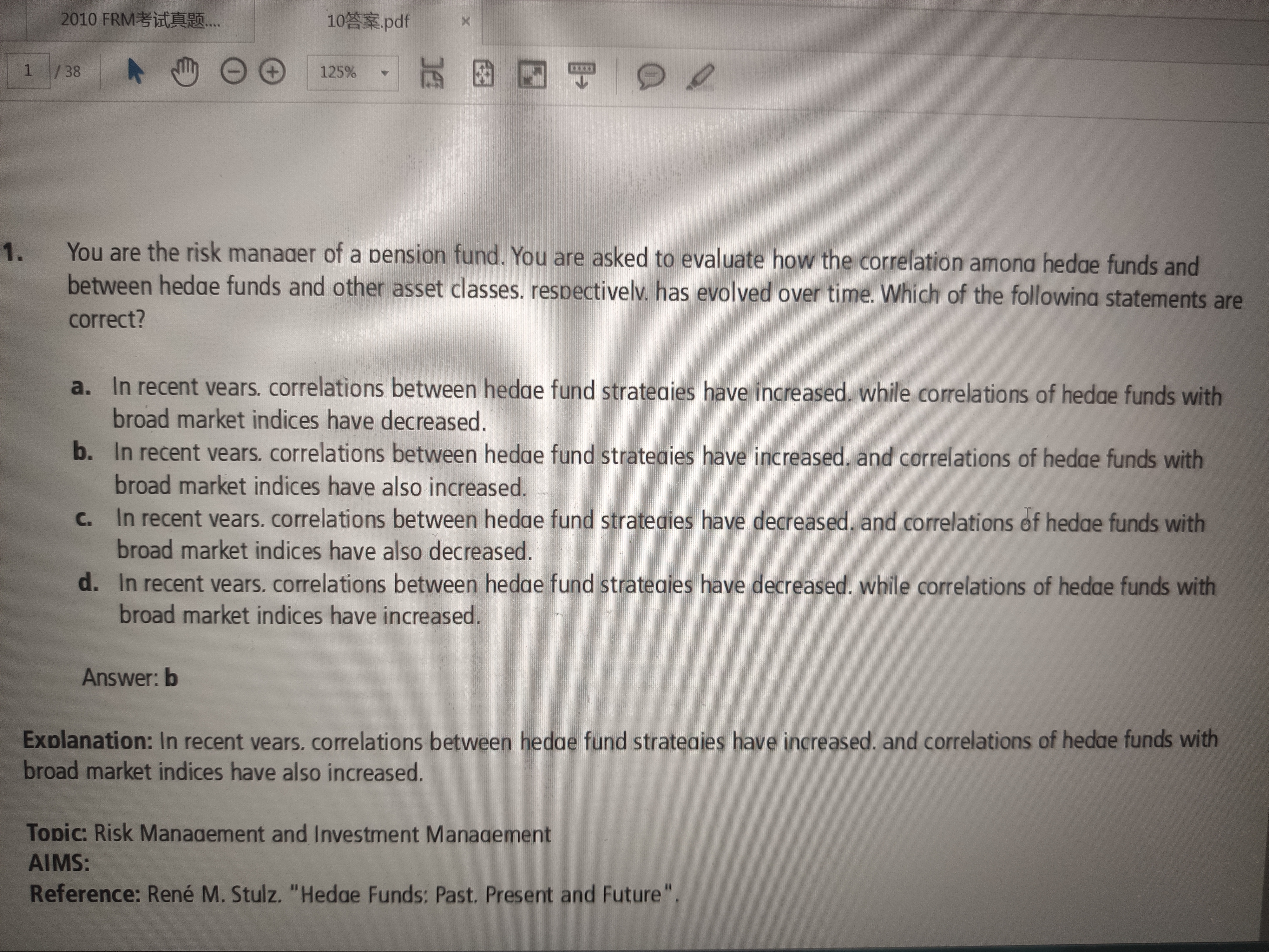 同学你好,这道题说的是当对冲基金与市场指数之间的相关性增加时(即系统性风险增加),对冲基金之间的相关性也增加,就像在金融危机时,组合内部的相关性随着系统性风险的增加急剧上升,此外不建议同学做比较早的题目,因为FRM考试考纲变换比较频繁。