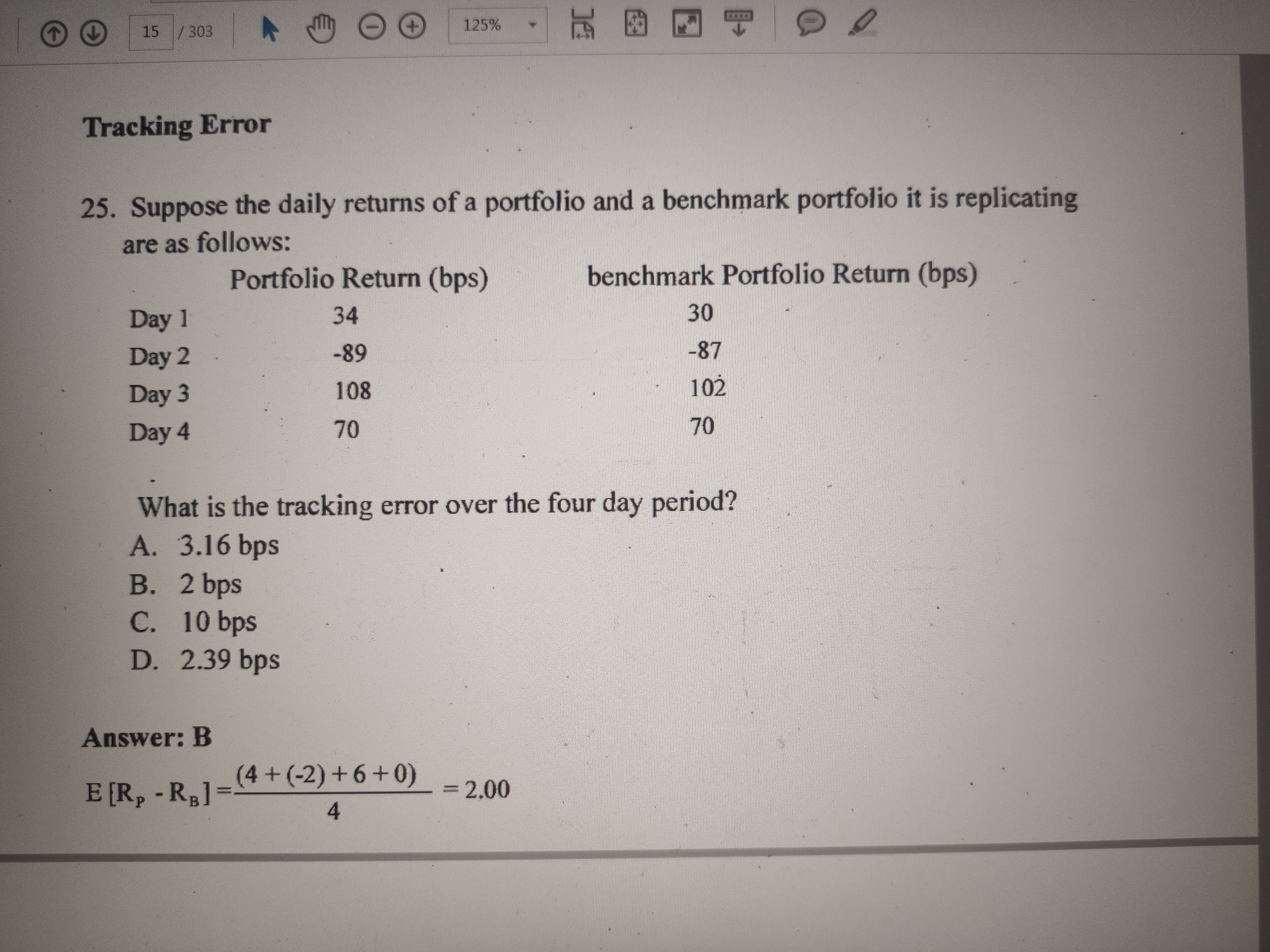 同学你好,答案错了,解析中算出来的2是均值,而追踪误差是标准差,计算过程为开方{【(4-2)+(-2-2)+(6-2)+(0-2)】/4}=0