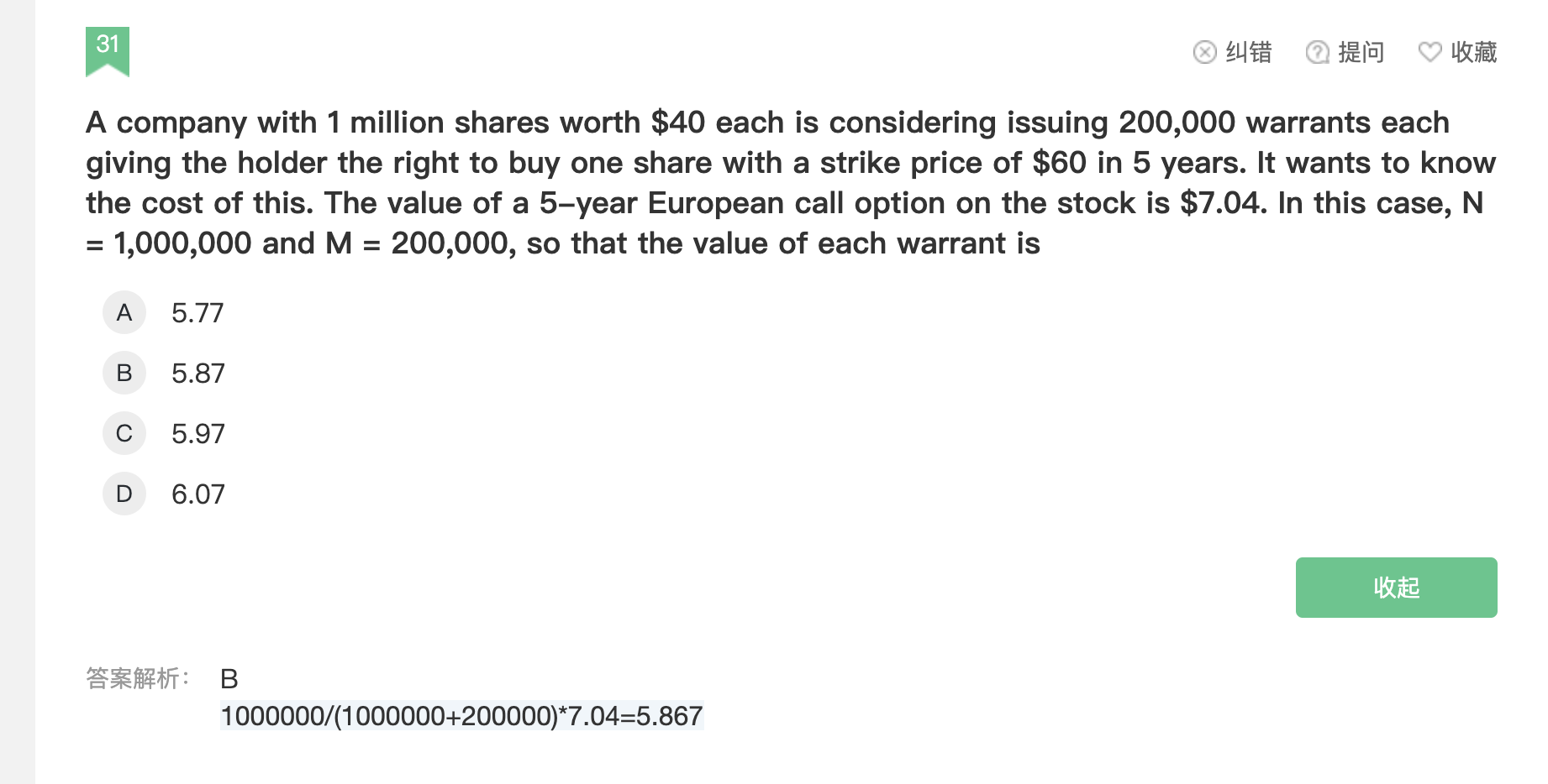 同学你好,这道题考的是权证和雇员股票期权的相关知识,这道题算的是每股认购权证的价值。N代表目前流通股的数量,M代表考虑发行权证的数量。