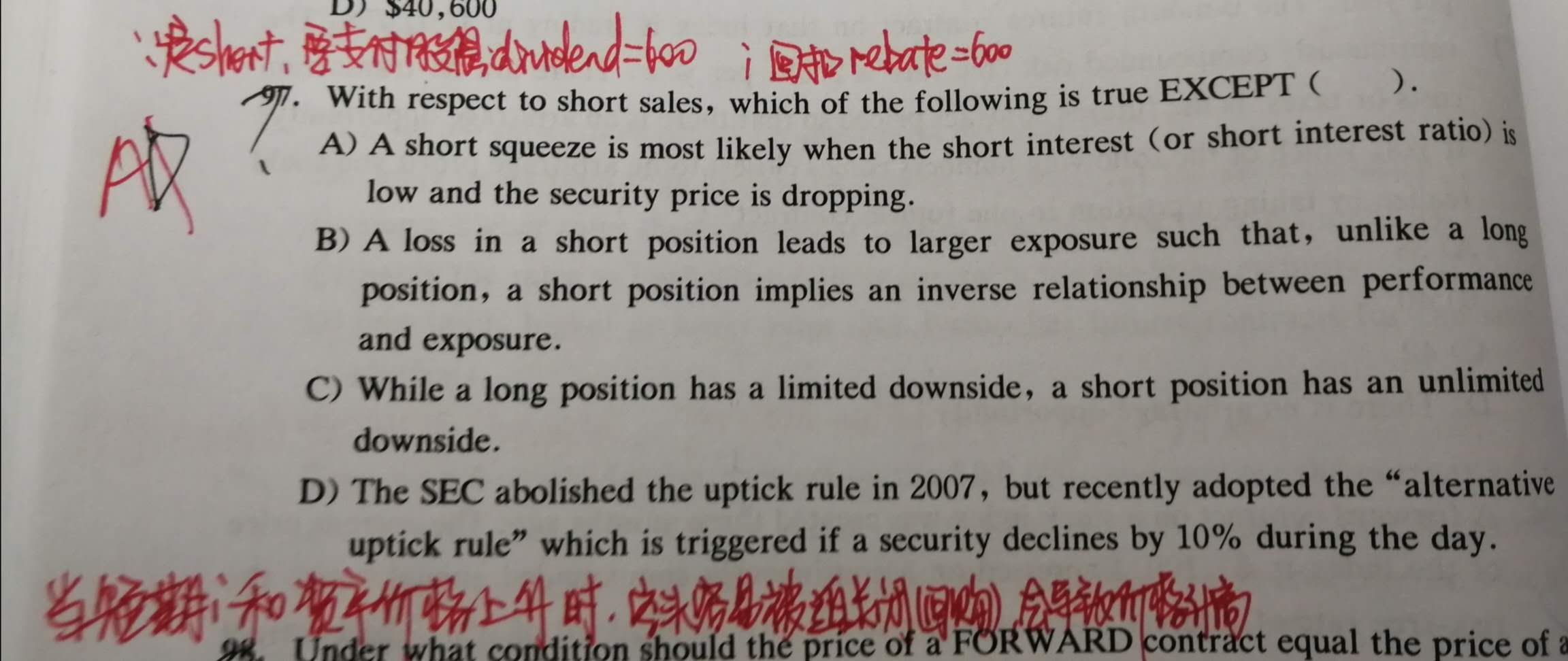 同学,B)做空仓位会导致更大的敞口,因此,与多头仓位不同,空头仓位意味着业绩和敞口之间的反向关系。C)多头头寸的下行空间有限,而空头头寸的下行空间则无限。D)证券交易委员会在2007年废除了上涨规则,但最近采用了“替代上涨规则”,如果证券在一天内下跌10%,就会触发该规则。是正确的