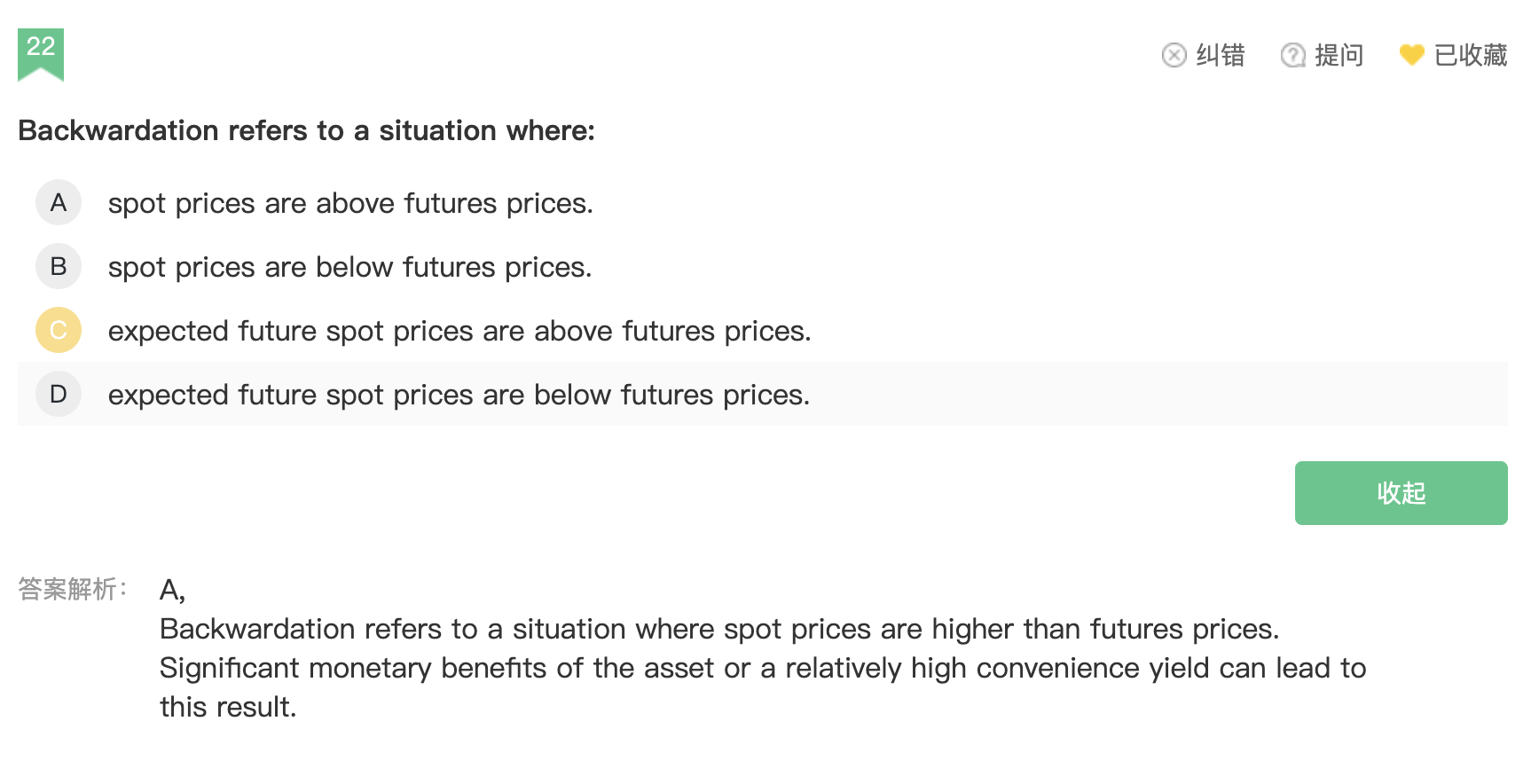 同学,CD选项中的expected future spot price和futures prices的比较是判断是否是normal Backwardation的方法,若expected future spot price大于futures prices,则为normal Backwardation,expected future spot price=Se^(Rt),公式中的R为加上风险溢价后的收益率