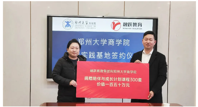双方发言后,在融跃教育董事长高磊,郑州大学商学院党委副书记、纪委书记王传芳及全体嘉宾的共同见证下,融跃教育向郑州大学商学院捐赠300套“陪伴与成长计划”课程,总价值150万元,将优质、专业的财经职业教育资源精准引入校园,为学院教学内容迭代升级、学生职业能力提升注入强劲动力。