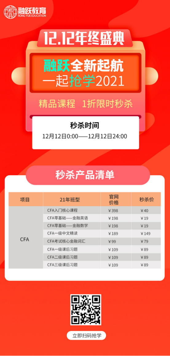 除了这个,这不是赶到了年末,融跃为回馈学员,在2020年12月12日有CFA秒杀哦!赶紧看看有没有你需要的秒杀课程呢?