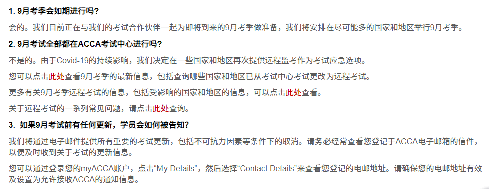 我们将于8月中旬开始就9月考季各考点可能实施的防疫规定及具体要求与学员进行沟通。由于各地疫情发展情况不同,请学员们及时留意相关规定和措施的更新情况,ACCA会持续发布更新消息。